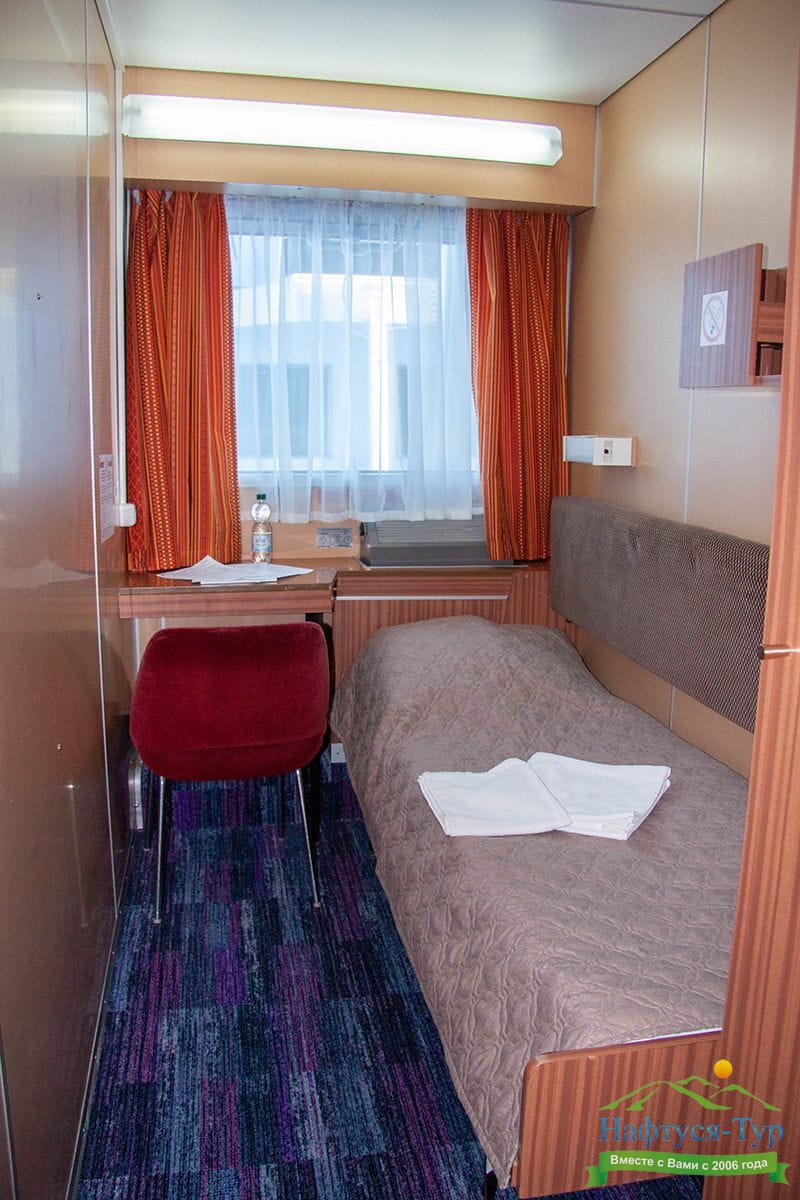В каюте: одно спальное место, шкаф для одежды, радио, душ, санузел, кондиционер, обзорное окно, электророзетка 220V.