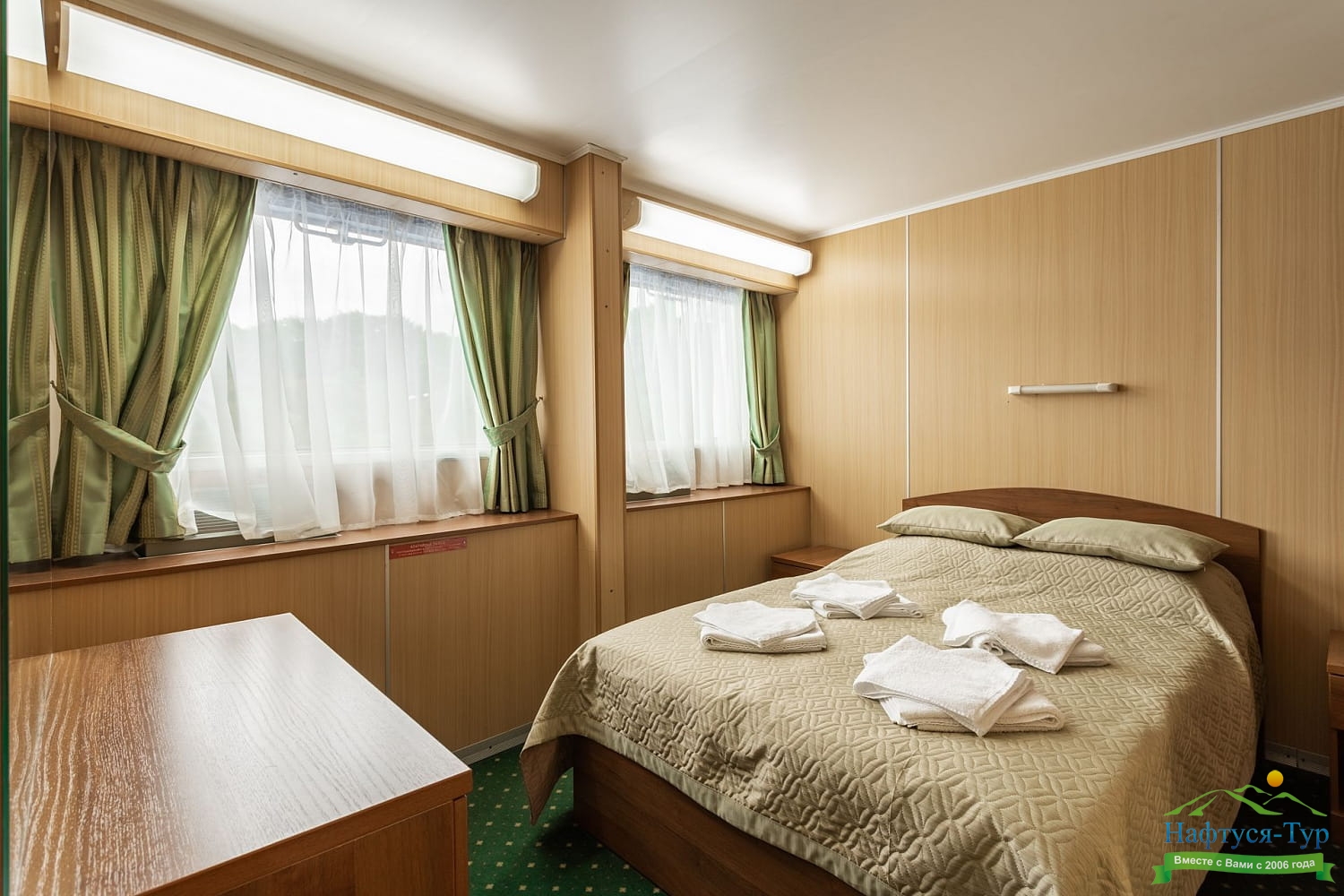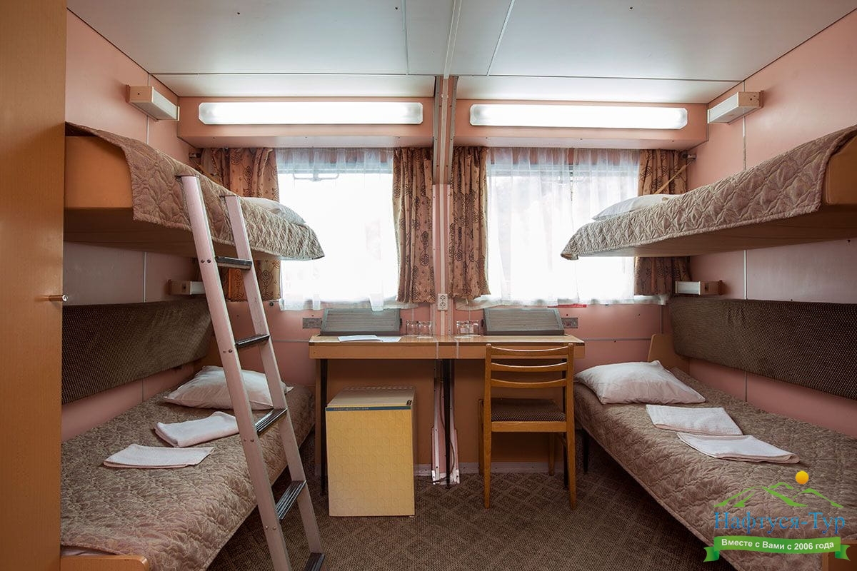 В каюте: четыре спальных места (два внизу, два вторым ярусом), шкаф для одежды, радио, душ, 2 санузла, холодильник, кондиционер, два обзорных окна, электророзетка 220V.