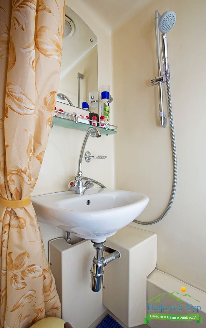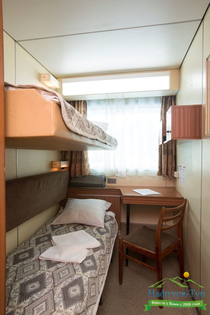 В каюте: два спальных места (одно над другим), шкаф для одежды, радио, душ, санузел, кондиционер, обзорное окно, электророзетка 220V.