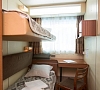 В каюте: три спальных места (два внизу, третье вторым ярусом), шкаф для одежды, радио, душ, санузел, кондиционер, обзорное окно, электророзетка 220V.