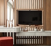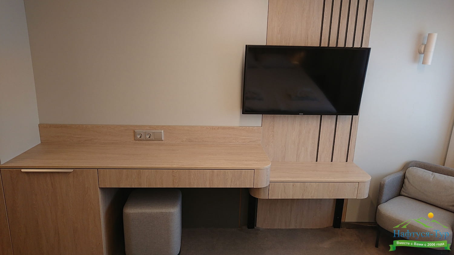 Комфортабельная гостиная с современным интерьером, шкаф для одежды, журнальный столик, мягкая мебель, телевизор, холодильник, капсульная кофемашина, фен, радио, два обзорных окна, электророзетка на 220V. В спальне: двуспальная кровать, шкаф для одежды, трюмо, два обзорных окна: