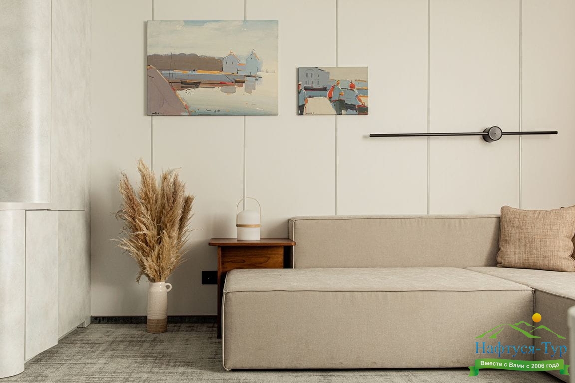 Комфортабельная гостиная с современным интерьером, шкаф для одежды, журнальный столик, мягкая мебель, телевизор, холодильник, капсульная кофемашина, фен, радио, два обзорных окна, электророзетка на 220V. В спальне: двуспальная кровать, шкаф для одежды, трюмо, два обзорных окна.