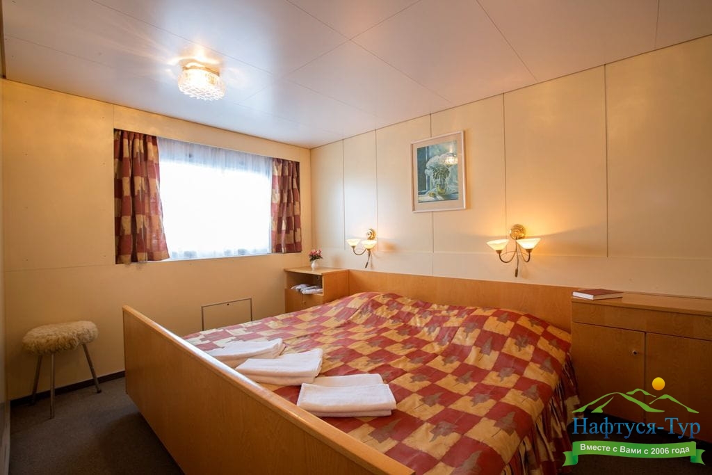 В каюте: два спальных места, шкаф для одежды, холодильник, телевизор, фен, радио, душ, санузел, кондиционер, обзорное окно, электророзетка на 220V.