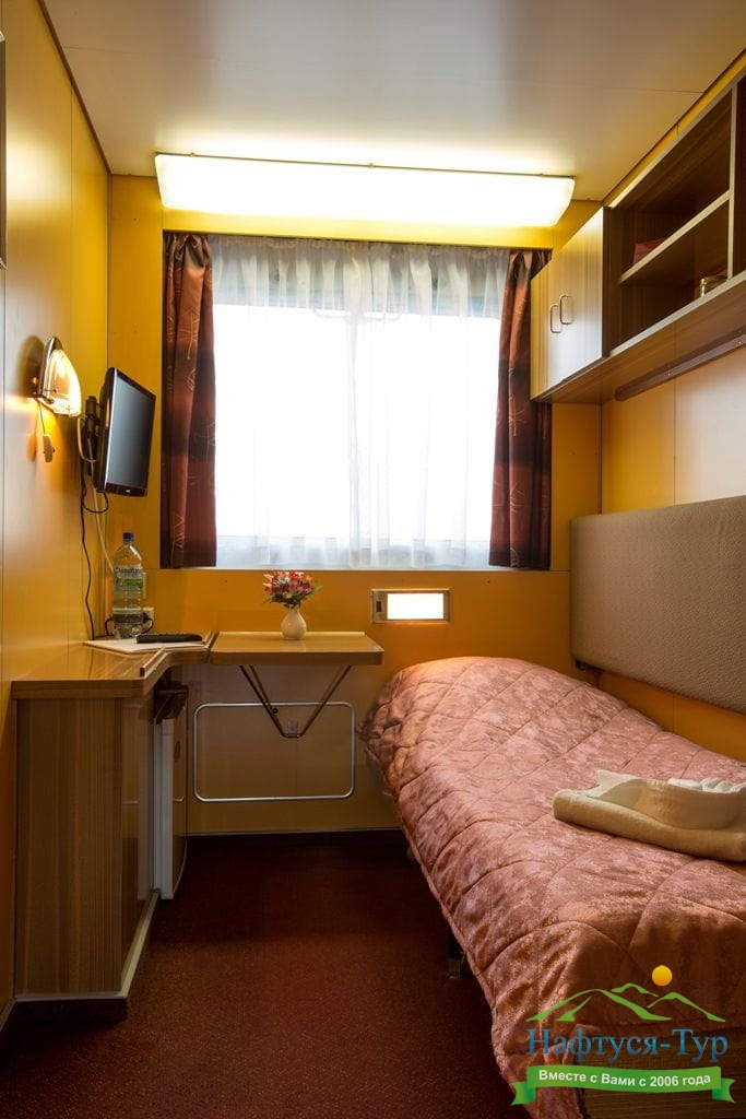 В каюте: одно спальное место, шкаф для одежды, холодильник, телевизор, фен, радио, душ, санузел, кондиционер, обзорное окно, электророзетка на 220V.