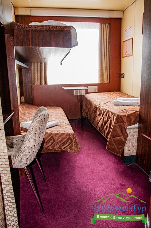 В каюте три спальных места (не сдвигаются), шкаф для одежды, радио, телевизор, холодильник, фен, сейф, кондиционер, душ, санузел, обзорное окно, электророзетка на 220V.