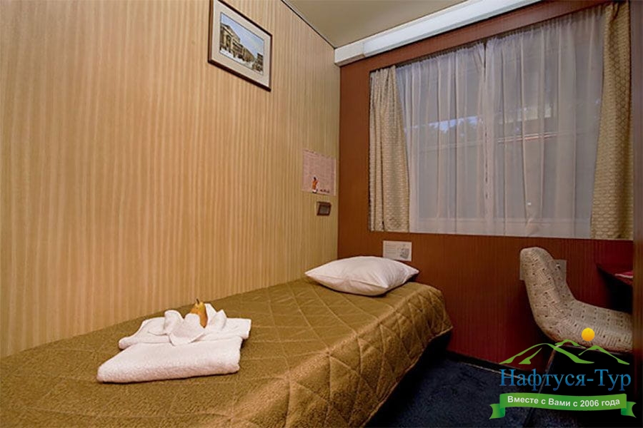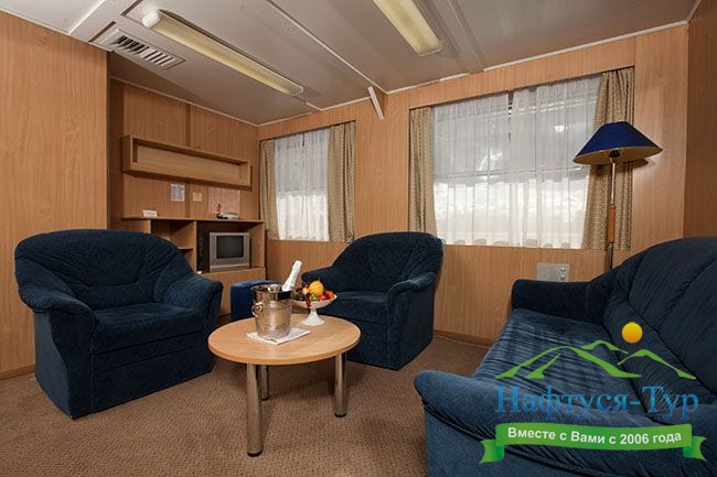 Комфортабельная комната с современным интерьером, два кресла, двуспальная кровать (раздвигается), шкаф для одежды, телевизор, холодильник, радио, сейф, фен, электророзетка на 220V.