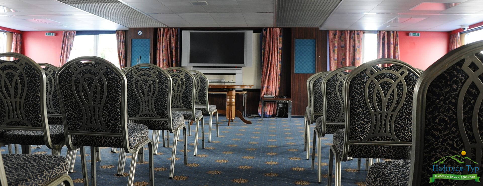 Во всех каютах: холодильник, телевизор, сейф, фен, шкаф, радио, кондиционер, душ, санузел, обзорное окно, электророзетка 220 V.