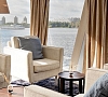 В каюте: панорамные окна, спутниковое ТВ, шкаф для одежды, холодильник, розетки 220V, телефон, радио, фен, кофемашина, сейф, душ, санузел. Площадь — 19 кв.м.