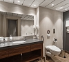 В каюте: панорамные окна, балкон, спутниковое ТВ, шкаф для одежды, холодильник, розетки 220V, телефон, радио, фен, кофемашина, cейф, душ, санузел. Площадь — 46 кв.м. (площадь балкона — 10 кв.м)