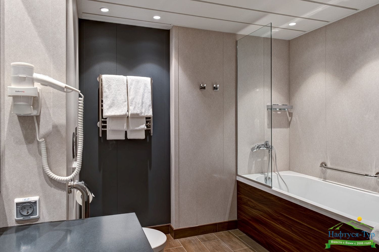 Просторная и комфортабельная каюта на теплоходе с большой, светлой ванной комнатой, балконом и всем необходимым для отдыха