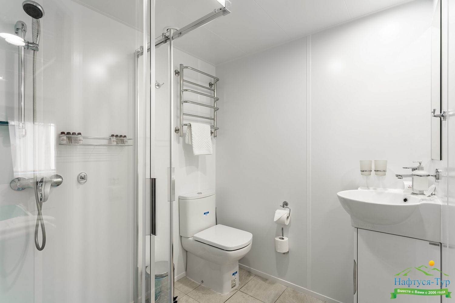 Расширена площадь санблока, отдельный душ, санузел, кондиционер. Площадь каюты — 30 кв.м.