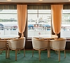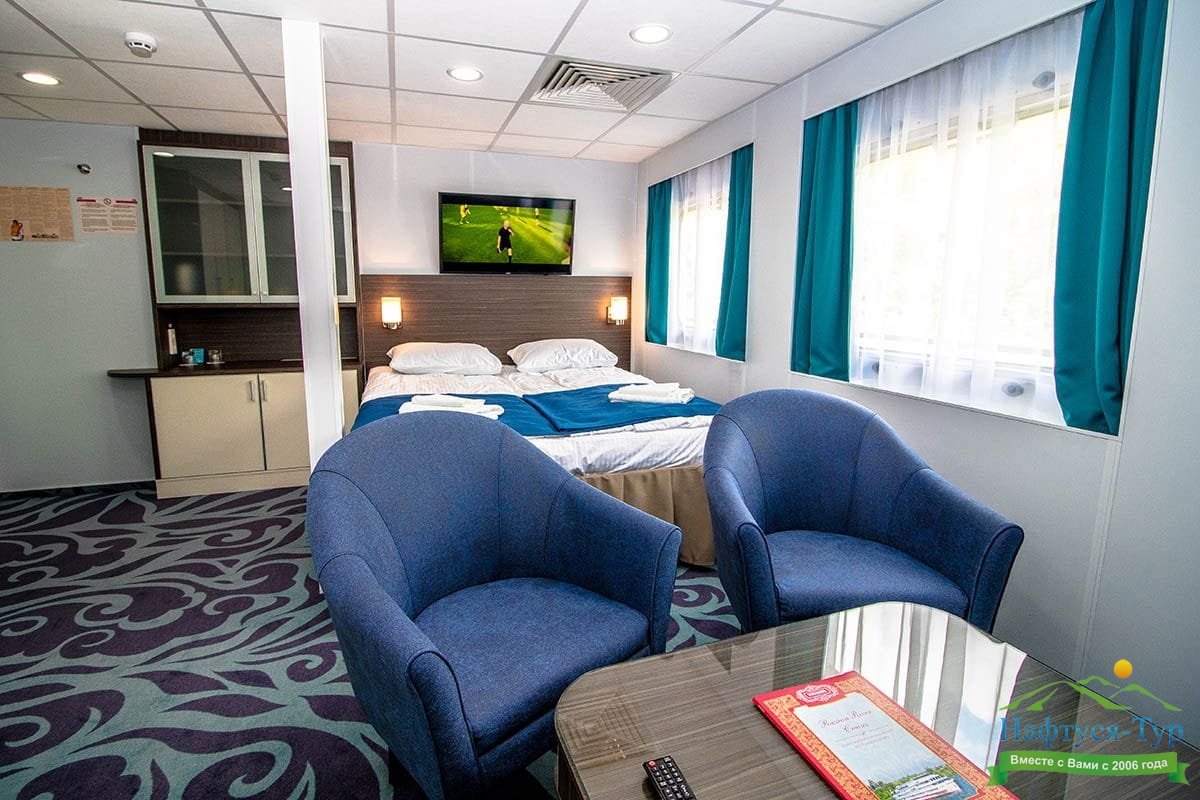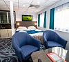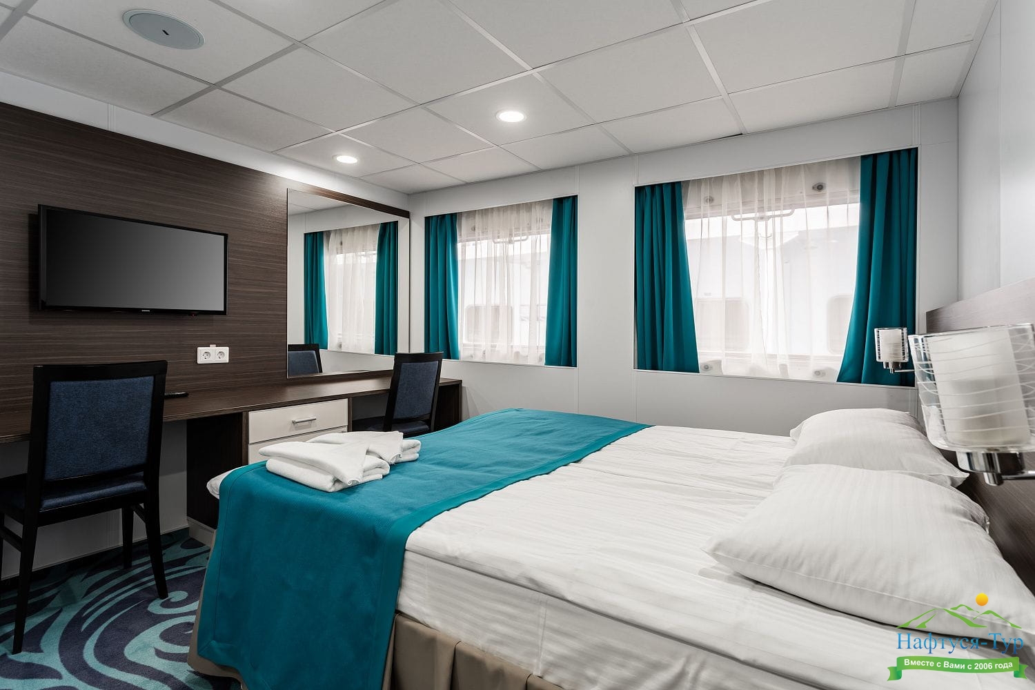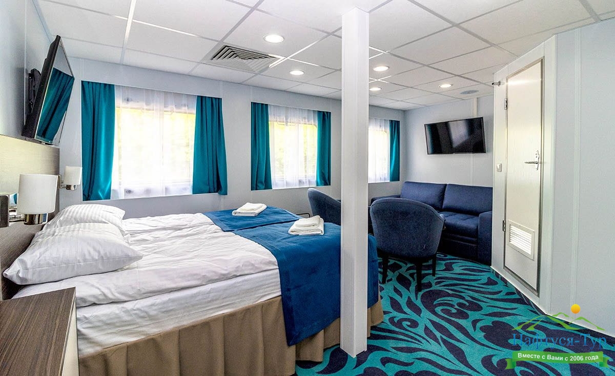 В каюте: двуспальная кровать, прикроватные тумбы, диван и кресло, журнальный столик, шкаф, телевизор, холодильник, радио, фен, сейф, три обзорных окна, электророзетка на 220V.