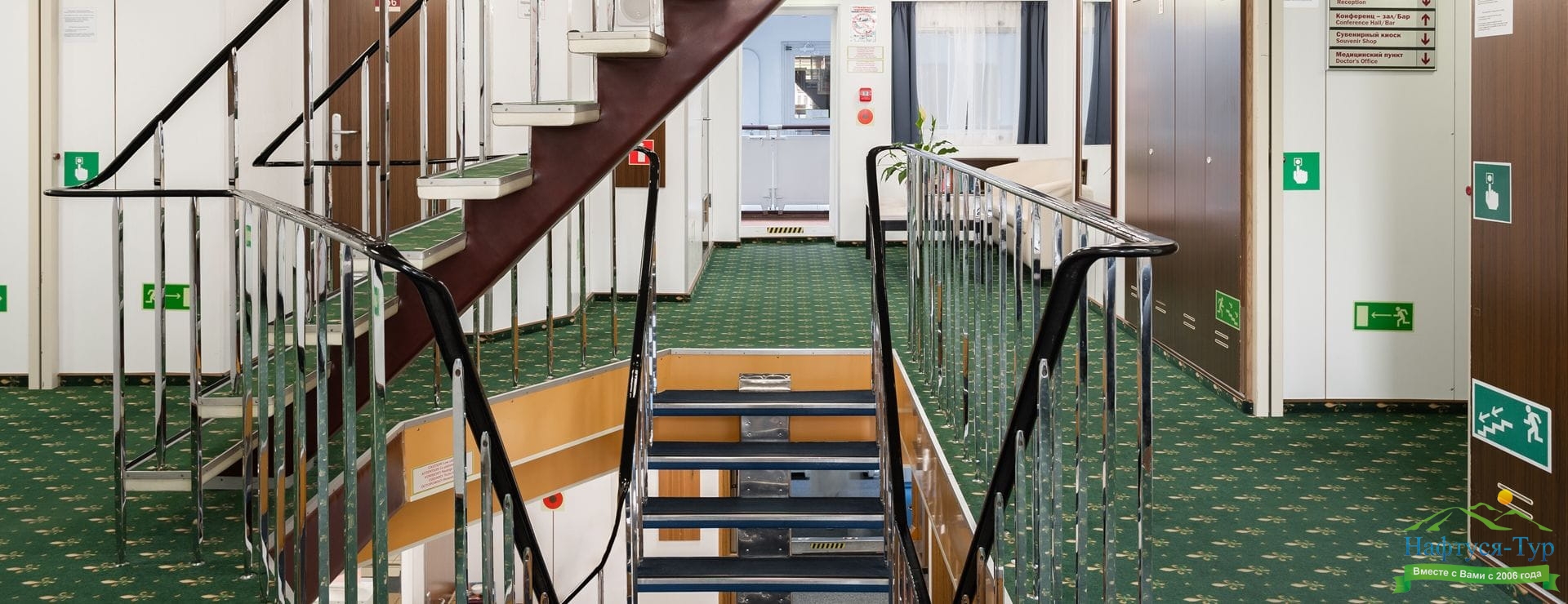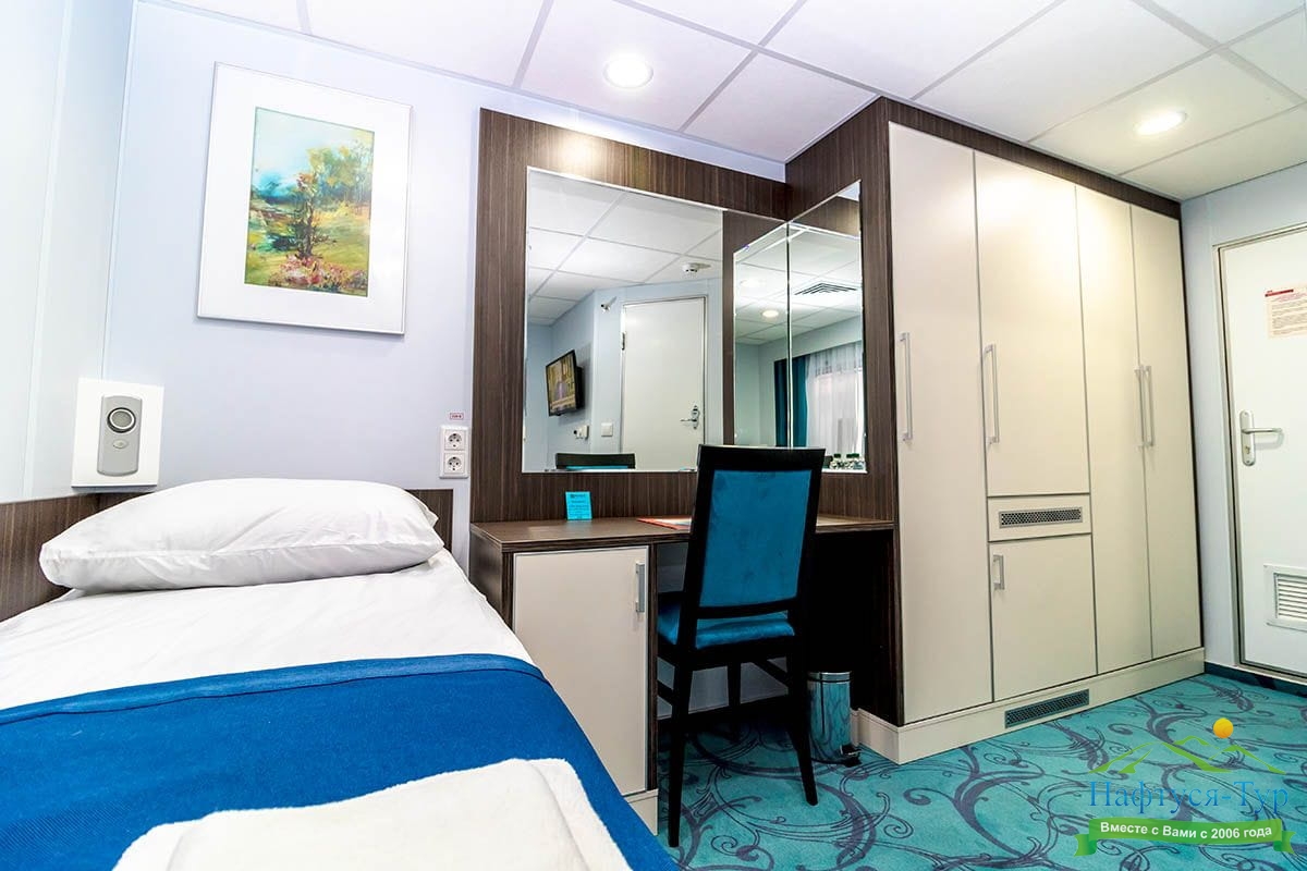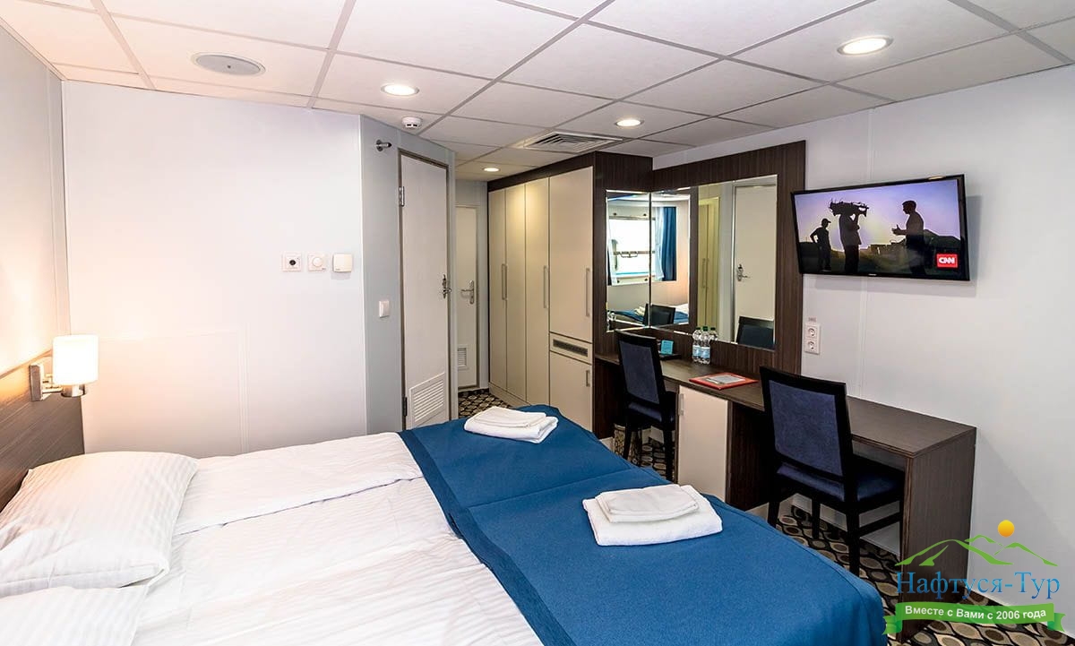 В каюте: одно спальное место, шкаф для одежды, радио, телевизор, холодильник, сейф, душ, санузел, кондиционер, обзорное окно, электророзетка на 220V.