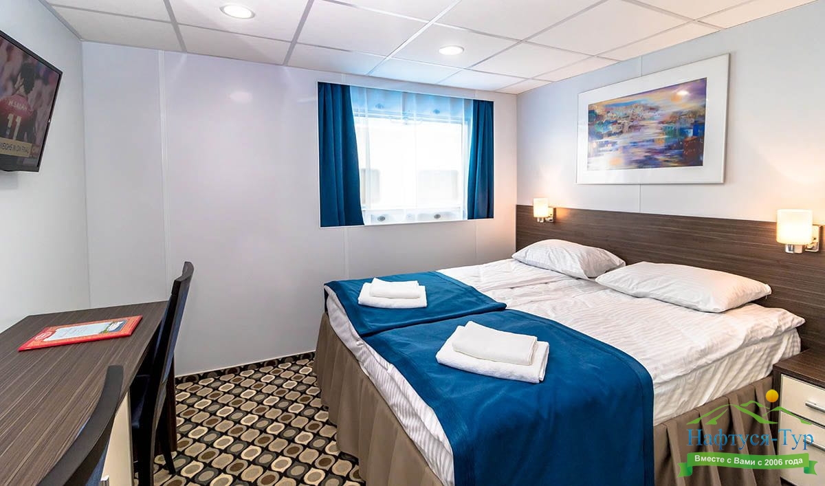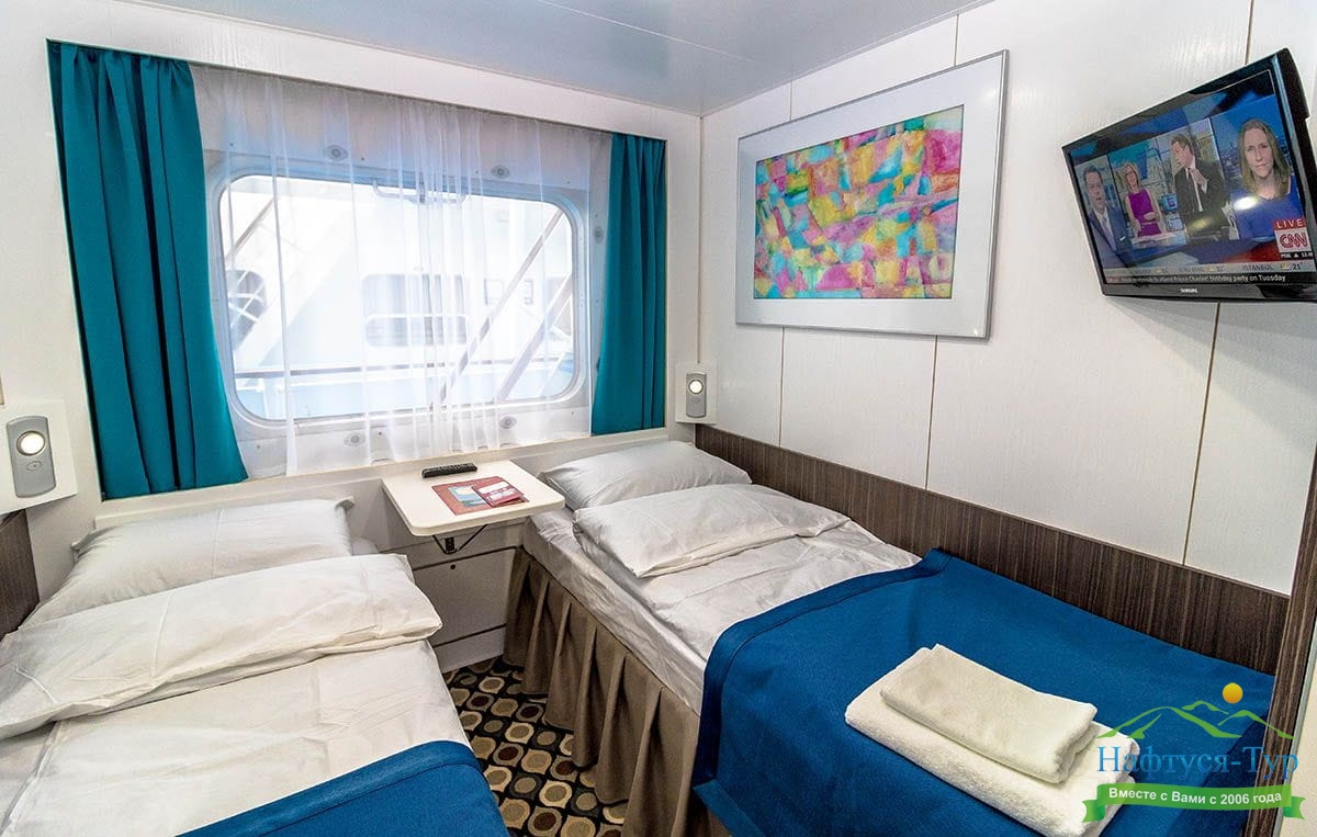 В каюте: три спальных места (два внизу, одно — вторым ярусом), шкаф для одежды, трюмо, радио, телевизор, холодильник, сейф, обзорное окно, электророзетка на 220V.