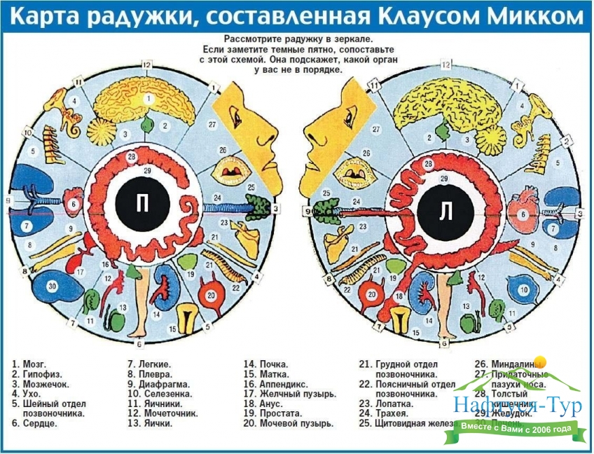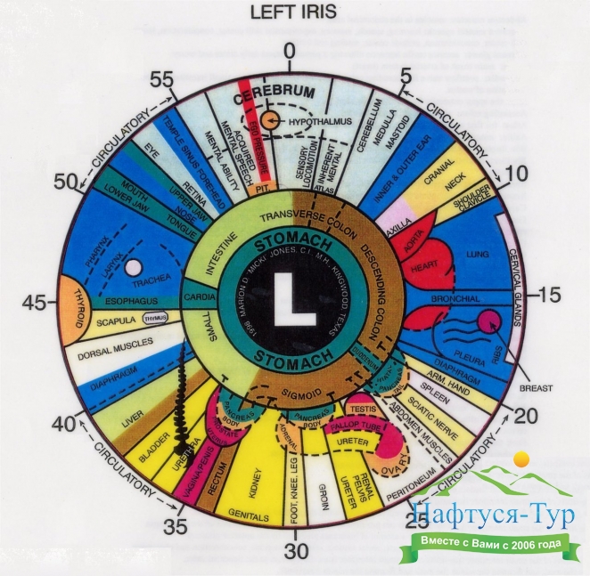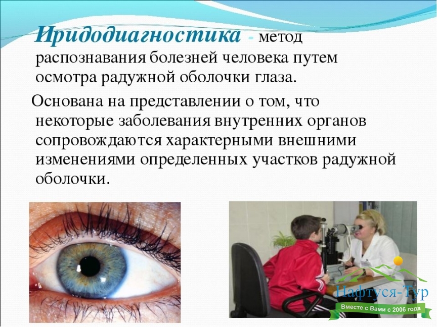 Иридодиагностика – методика диагностического исследования, при котором состояние организма (включая определение наличия конкретных заболеваний конкретных органов) оценивается по радужной оболочке глаз пациента. Методика применялась ещё тысячелетия назад, сегодня этот вид диагностики готовы предложить вам целый ряд санаториев нашей страны, хотя официально иридодиагностика продолжает считаться методом альтернативной медицины. Механизм диагностирования в данном случае основан на том, глаза являются частью головного мозга, а мозг через нервные и иные связи контролирует состояние всех органов. В свою очередь, состояние всех частей организма отражается на состоянии разных частей радужной оболочки глаза.К несомненным достоинствам иридодиагностики относятся полная безопасность и безвредность методики, ведь при проведении процедуры не используются вредные излучения. Процедура безболезненна и непродолжительна, но при этом позволяет получить полную картину состояния всех органов и организма в целом, определить способы лечения и предупреждения грозящих заболеваний.