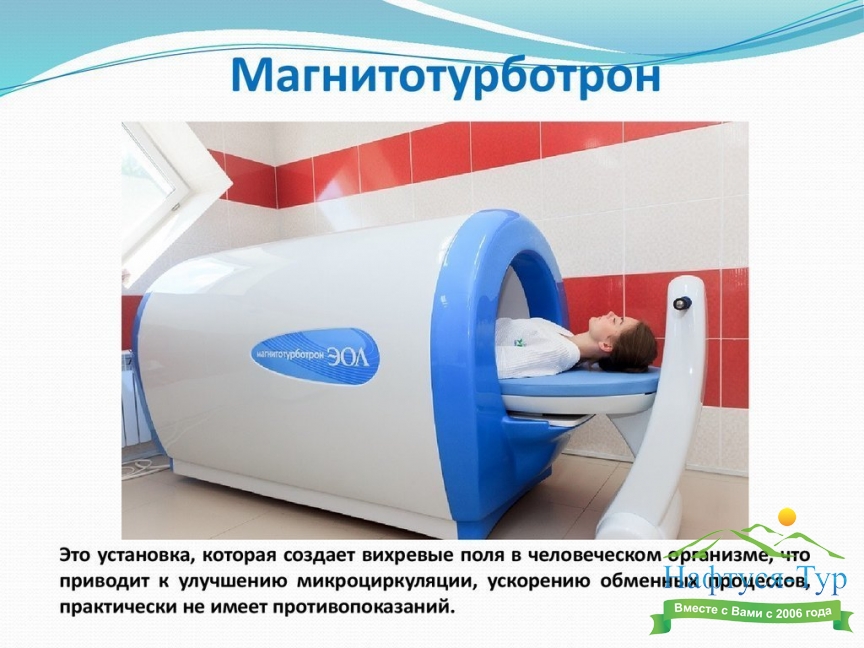 Магнитотурботрон – медицинский аппарат, предназначенный для проведения лечения и профилактики множества заболеваний с помощью одного из видов магнитотерапии (лечения воздействием магнитного поля). Эта аппаратура представляет собой массивную установку, которая создает вращающееся магнитное поле. В начале сеанса, а также в ходе его течения могут устанавливаться и изменяться параметры поля (частота, модуль, индукция), а также направление вращения. Благодаря воздействию генерируемого магнитотурботроном поля, в организме пациента возникают вихревые токи, обеспечивающие улучшение циркуляции крови, ускорение метаболизма, укрепление иммунитета.К несомненным достоинствам предлагаемых санаториями курсов лечения с использованием магнитотурботрона относится многоплановое воздействие на ткани без ограничения по глубине. Курсы такой терапии назначают при бронхитах, пневмонии, астме, остеохондрозах, остеоартрозах и артритах, травмах, синдромах хронической утомляемости, нарушениях в работе сердечнососудистой и нервной систем, ЖКТ, мочеполовых проблемах, заболеваниях кожи, иммунодефицитных и опухолевых заболеваниях.