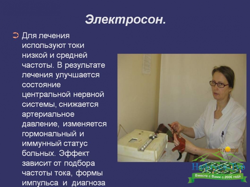 Электросон (электросонтерапия) – физиотерапевтическая методика, при которой, благодаря воздействию на центральную нервную систему пациента слабых разрядов тока, происходит его погружение в особое состояние, близкое к обычному сну. В первую очередь данную процедуру медики санаториев используют для борьбы с заболеваниями неврогенной природы. Сеансы электросна позволяют эффективно восстанавливать эмоциональное равновесие, оказывают обезболивающий эффект, нормализуют нервную деятельность, улучшают кровоснабжение головного мозга. Также результатом применения данной физиотерапевтической методики является нормализация процесса кроветворения, активизирование работы ЖКТ, снижение уровня холестерина в крови, стимуляция выработки эндорфинов.Санатории нашей страны используют электросонтерапию очень широко, поскольку данная процедура может применяться практически при любых видах заболеваний. В первую очередь она показана гипертоникам и гипотоникам, людям, страдающим нервными расстройствами, болевыми синдромами и гормональными нарушениями.