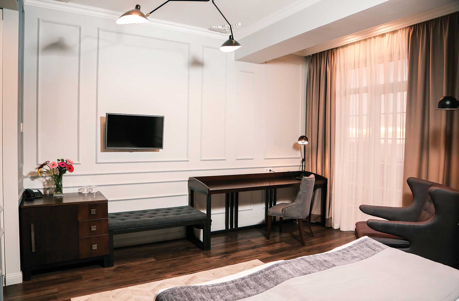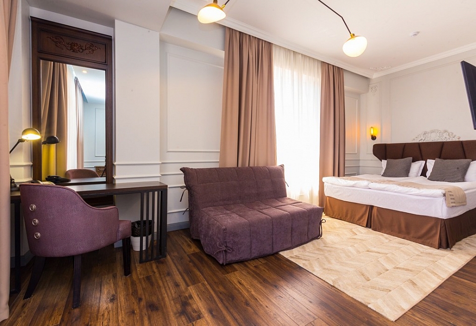 Отдыхали семьей из трех человек с 30.08 по 8.09.17. Все понравилось. Красиво, Чисто.Вкусно. В номере есть все необходимое:холодильник, телевизор, сейф, кондиционер, халаты, тапочки, гель, шампунь, крем для обуви, нитки с иголкой, фен, полотенца меняют по потребности.