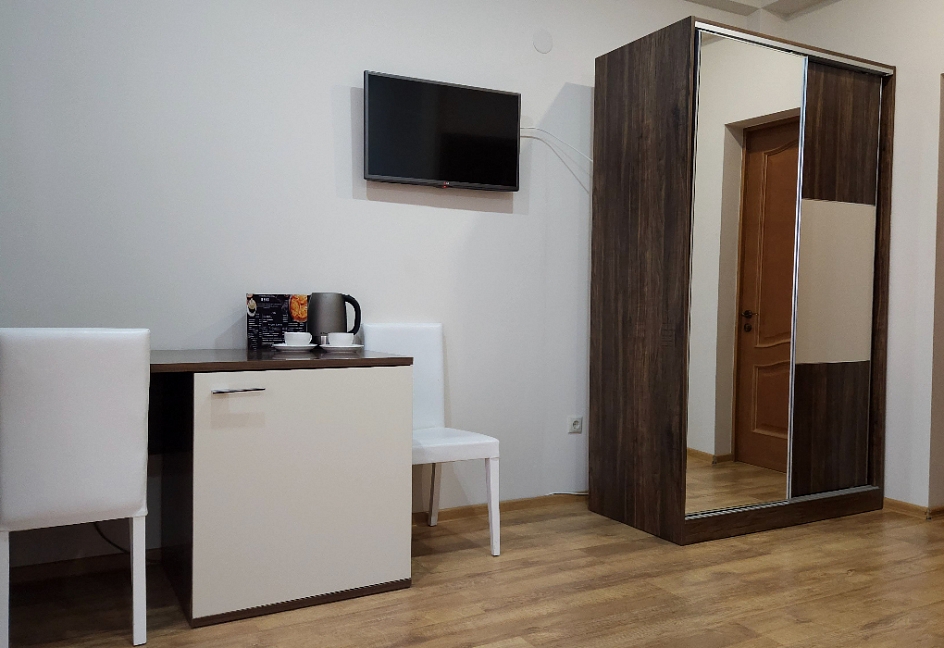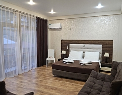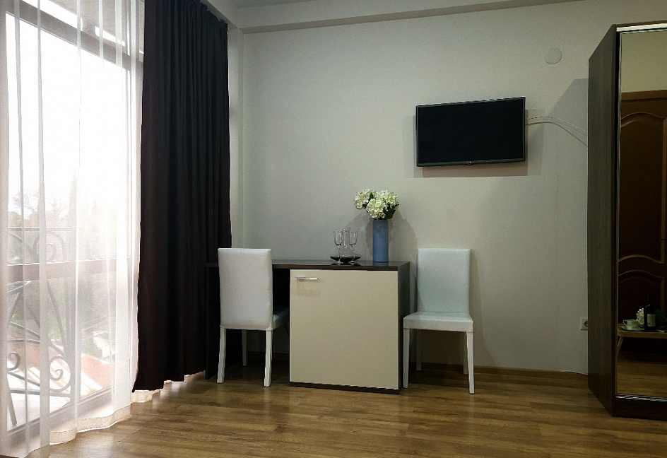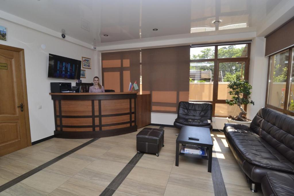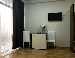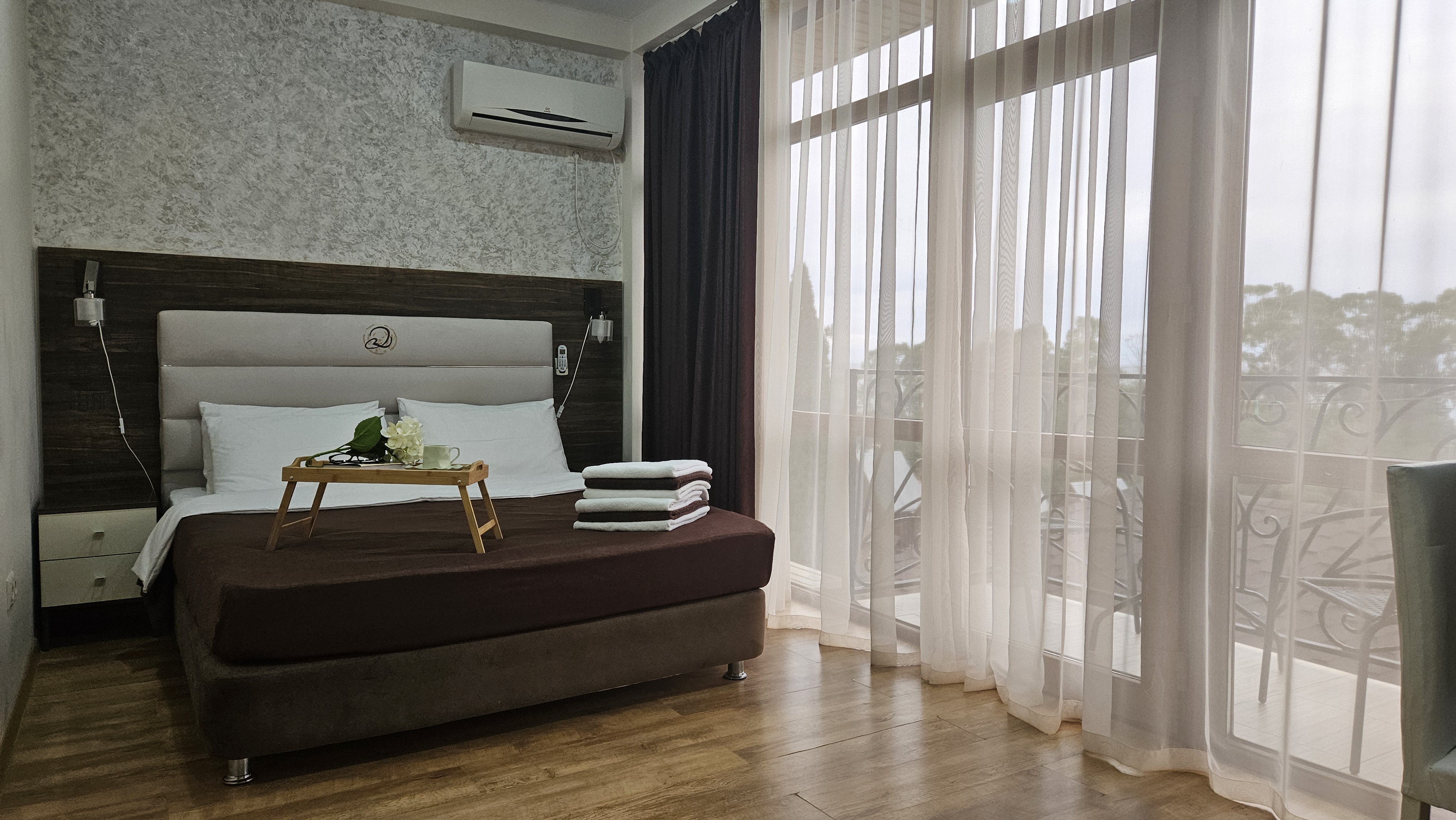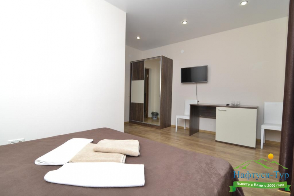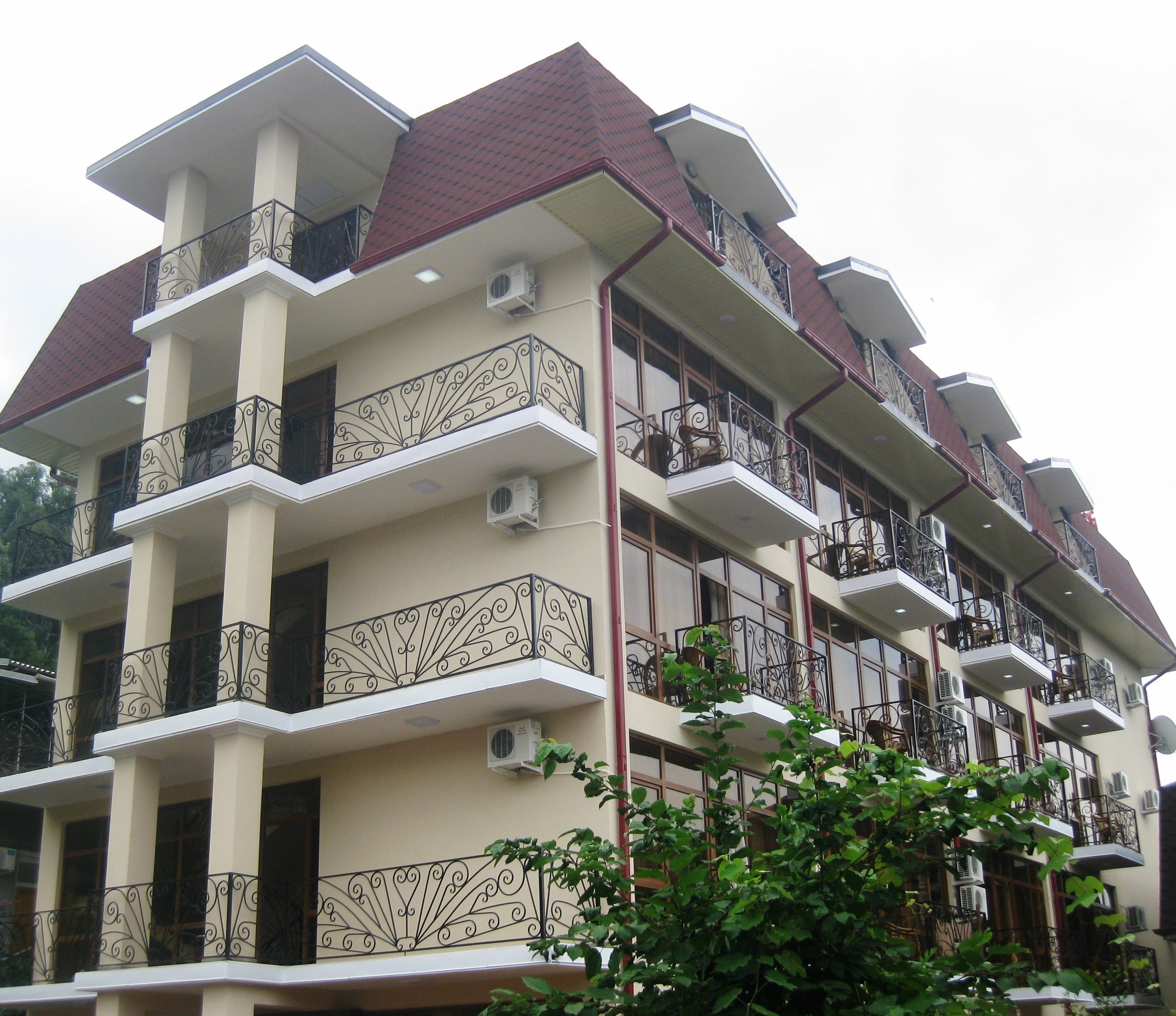 1. Плюсы: отель новый, это чувствуется и по номерам и по мебели - все безупречно от смесителей в раковинах (очень красивые) до постельного белья, оно белоснежно, полотенца меняют раз в 3-4 дня (мы отдыхали неделю, нам поменяли 1 раз). Территория отеля круглосуточно охраняется вневедомственной охраной. В холле или во дворе постоянно дежурит специалист. Персонал отеля все как один радушны и дружелюбны. Очень понравилось общаться с администратором Риммой, горничными Мартой и еще одной горничной, имени к сожалению не помню. Косметическая уборка номера протирка полов и вынос мусора каждый день (!) - девочки, спасибо! У нас в стоимость проживания входили завтраки. В очень стильном кафе каждый день бессменная Ирина. Она и накроет и выполнит любую просьбу. Большое ей спасибо. Столик в кафе закреплен за конкретным номером. Приходишь, садишься и тебе накрывают по стандартному меню (ни больше ни меньше): круглая булочка и кусочек масла, каша (меняется раз в 3 дня -это геркулес, рисовая, манная) и еще одно блюдо которое ежедневно чередуется - это или 2 блинчика со сметаной, или глазунья на 2 яйца, или омлет, или сырники. Чай, кофе каждый сам наливает на свое усмотрение из пакетиков. Дополнительно мы просили Иру и она приносила нам чашку молока, мы им кофе и чай разбавляли. Конечно не хватало сыра и овощей на завтрак (как пожелание). Есть WiFi!
