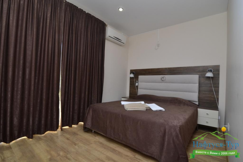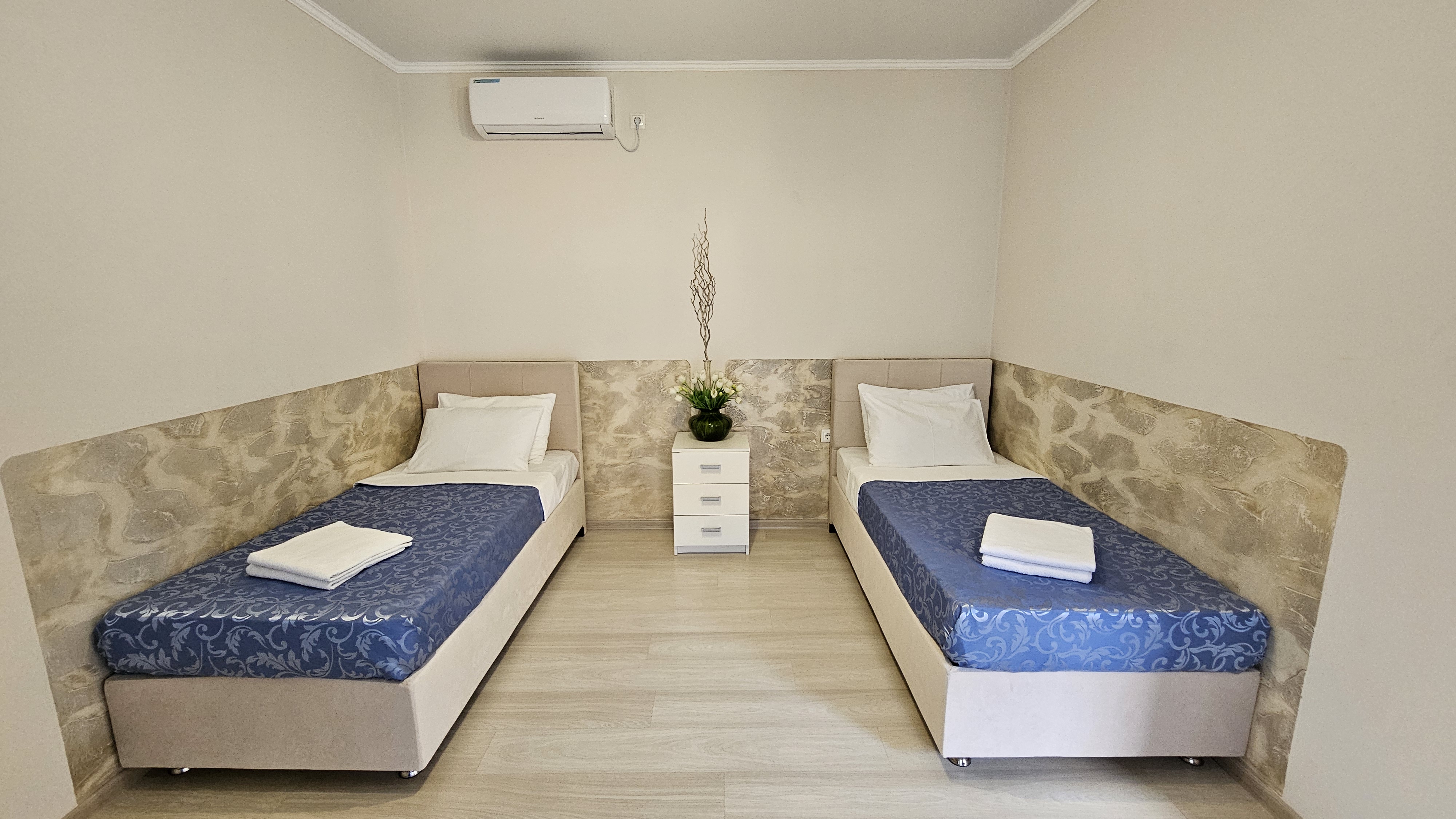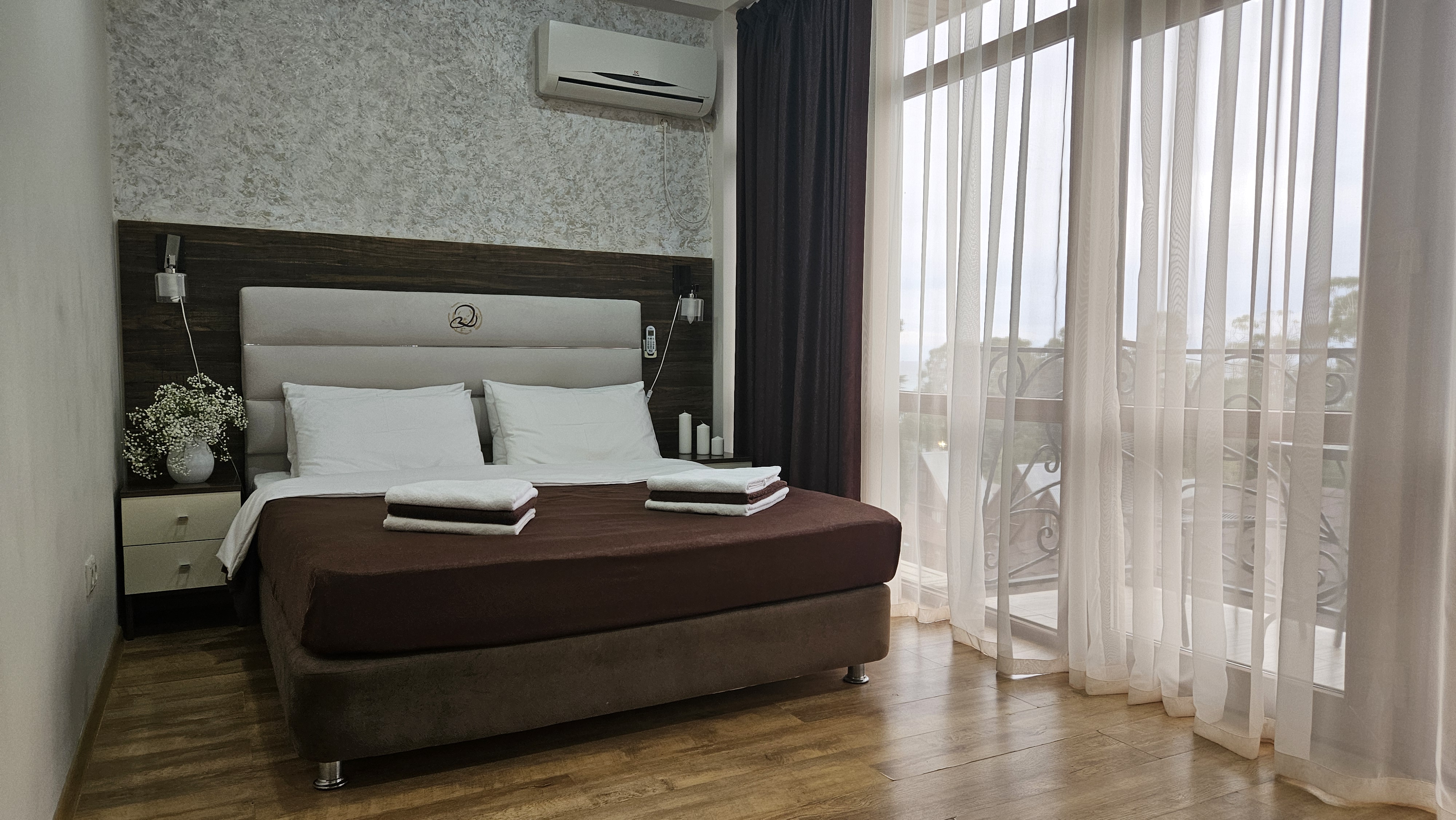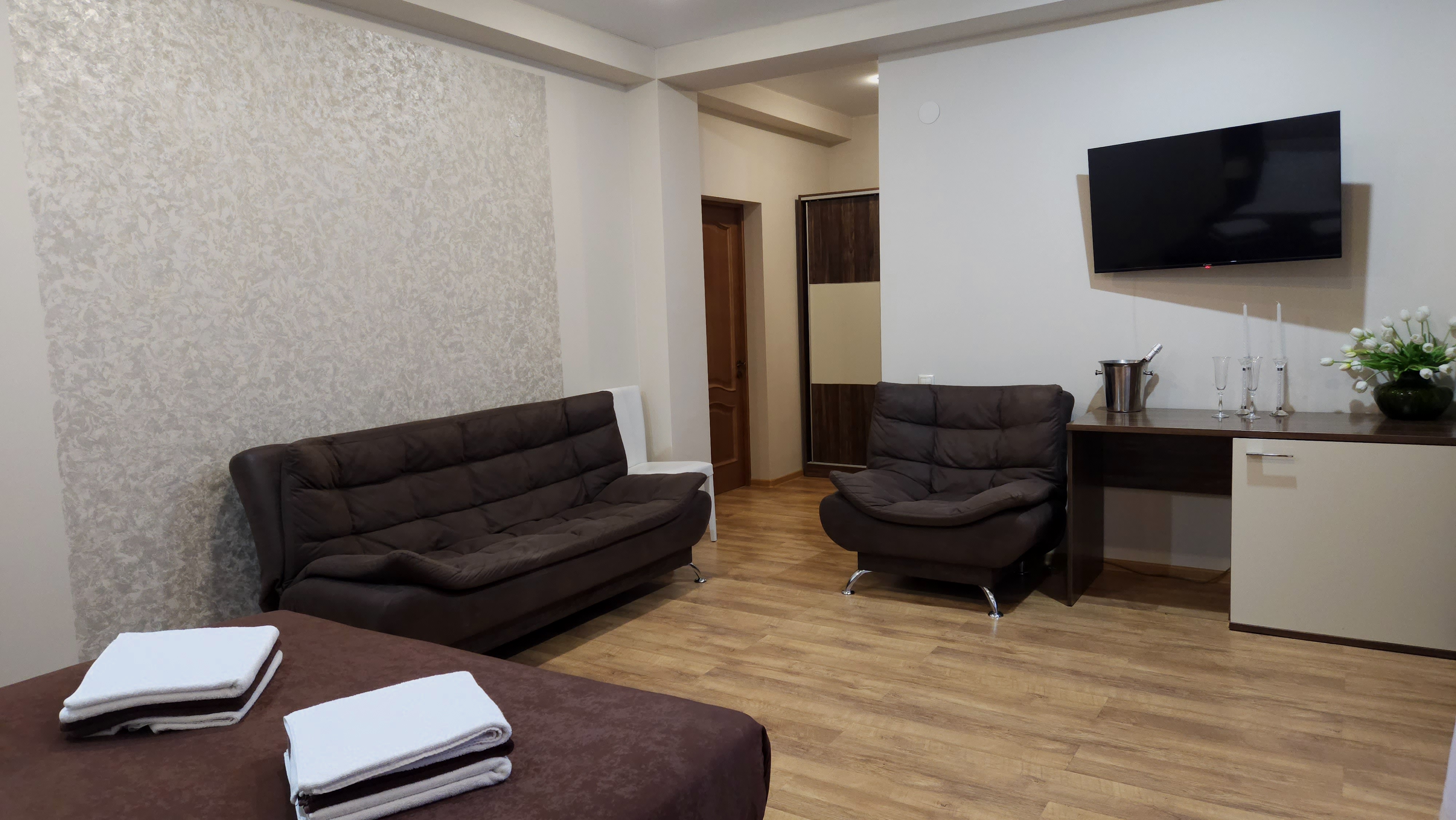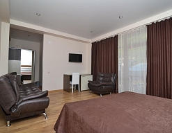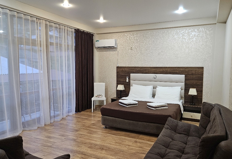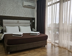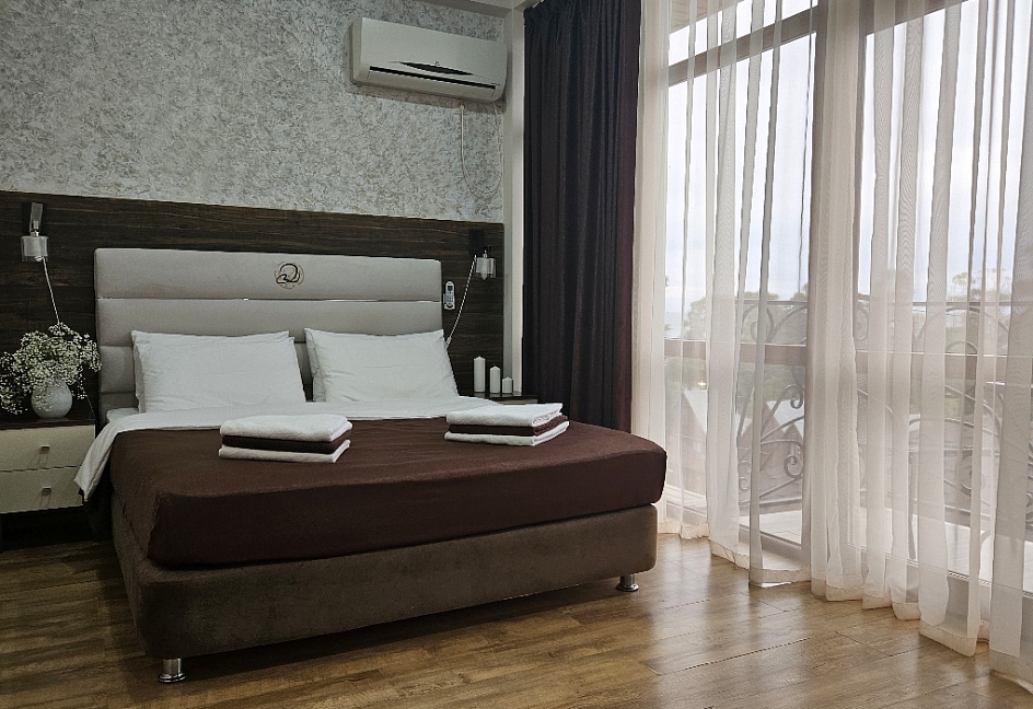 1. Плюсы: отель новый, это чувствуется и по номерам и по мебели - все безупречно от смесителей в раковинах (очень красивые) до постельного белья, оно белоснежно, полотенца меняют раз в 3-4 дня (мы отдыхали неделю, нам поменяли 1 раз). Территория отеля круглосуточно охраняется вневедомственной охраной. В холле или во дворе постоянно дежурит специалист. Персонал отеля все как один радушны и дружелюбны. Очень понравилось общаться с администратором Риммой, горничными Мартой и еще одной горничной, имени к сожалению не помню. Косметическая уборка номера протирка полов и вынос мусора каждый день (!) - девочки, спасибо! У нас в стоимость проживания входили завтраки. В очень стильном кафе каждый день бессменная Ирина. Она и накроет и выполнит любую просьбу. Большое ей спасибо. Столик в кафе закреплен за конкретным номером. Приходишь, садишься и тебе накрывают по стандартному меню (ни больше ни меньше): круглая булочка и кусочек масла, каша (меняется раз в 3 дня -это геркулес, рисовая, манная) и еще одно блюдо которое ежедневно чередуется - это или 2 блинчика со сметаной, или глазунья на 2 яйца, или омлет, или сырники. Чай, кофе каждый сам наливает на свое усмотрение из пакетиков. Дополнительно мы просили Иру и она приносила нам чашку молока, мы им кофе и чай разбавляли. Конечно не хватало сыра и овощей на завтрак (как пожелание). Есть WiFi!