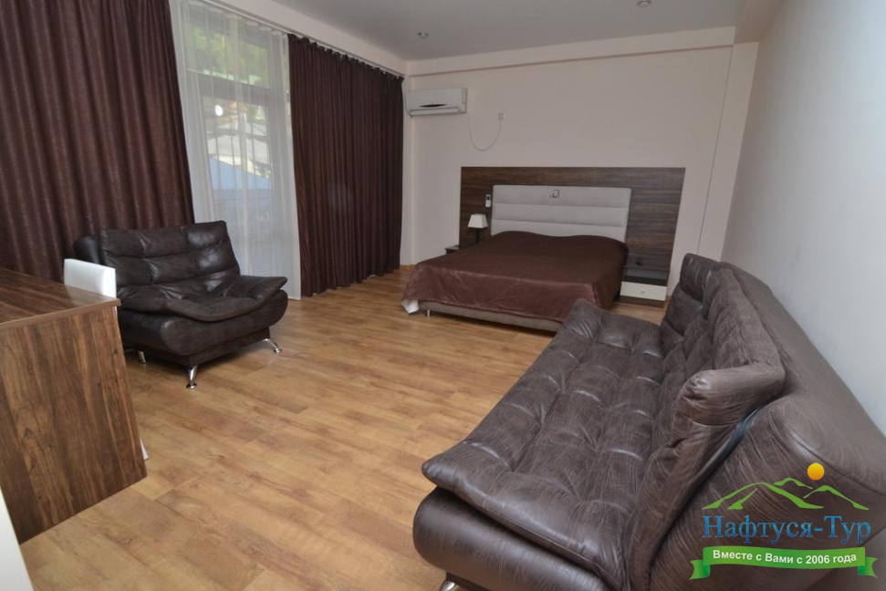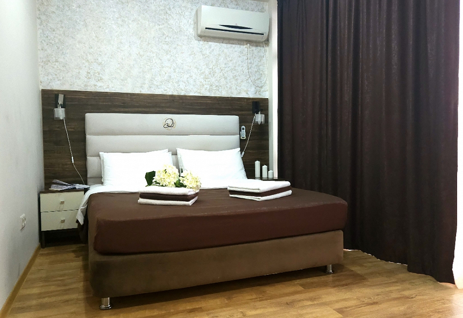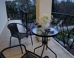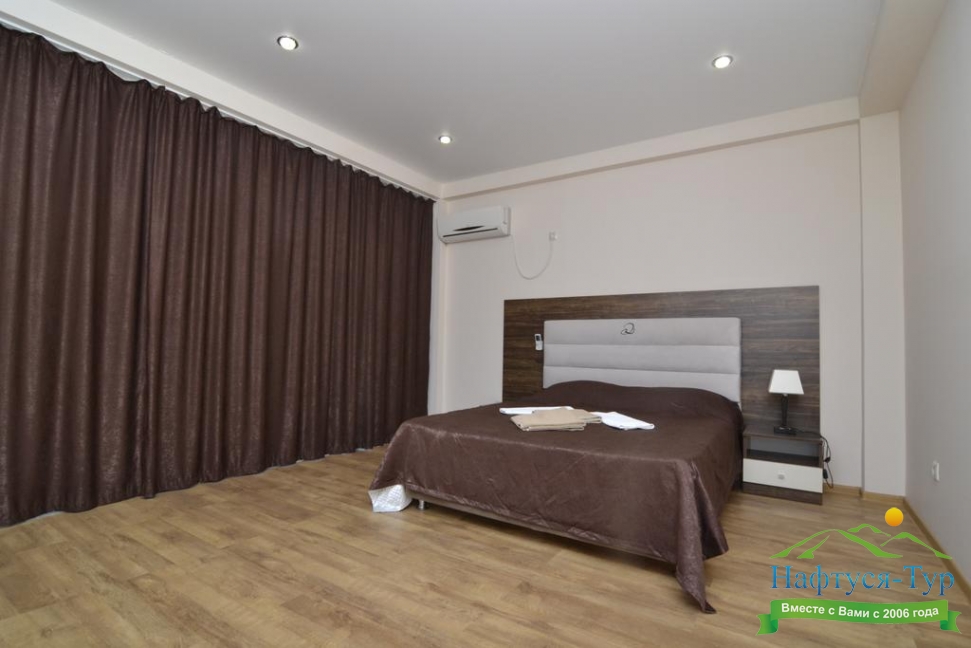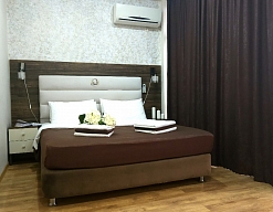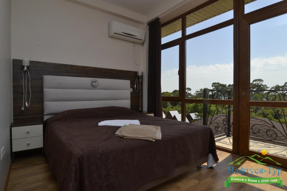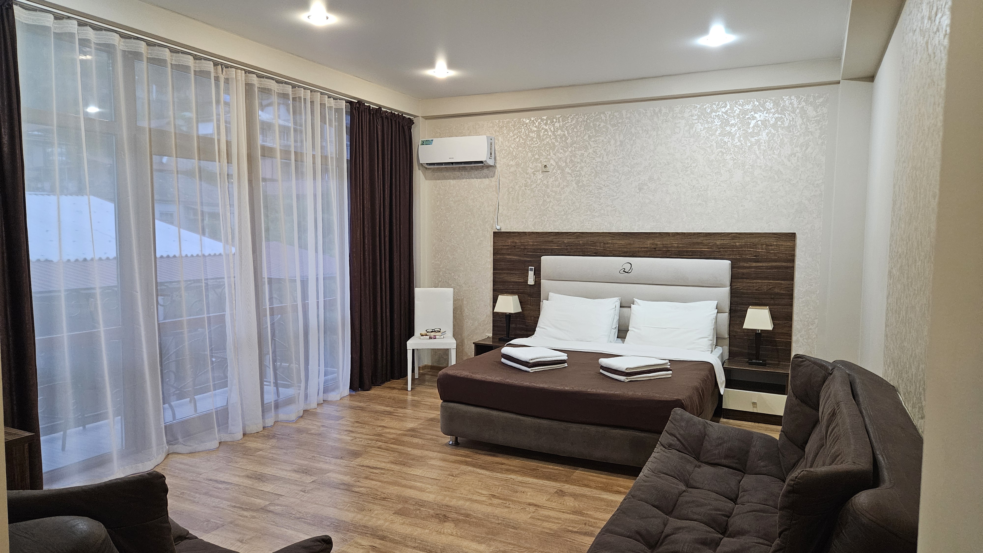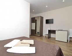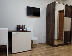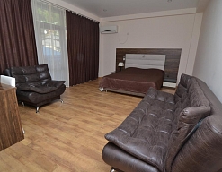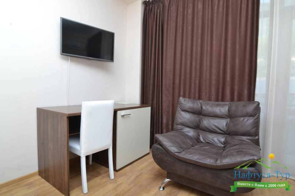 1. Плюсы: отель новый, это чувствуется и по номерам и по мебели - все безупречно от смесителей в раковинах (очень красивые) до постельного белья, оно белоснежно, полотенца меняют раз в 3-4 дня (мы отдыхали неделю, нам поменяли 1 раз). Территория отеля круглосуточно охраняется вневедомственной охраной. В холле или во дворе постоянно дежурит специалист. Персонал отеля все как один радушны и дружелюбны. Очень понравилось общаться с администратором Риммой, горничными Мартой и еще одной горничной, имени к сожалению не помню. Косметическая уборка номера протирка полов и вынос мусора каждый день (!) - девочки, спасибо! У нас в стоимость проживания входили завтраки. В очень стильном кафе каждый день бессменная Ирина. Она и накроет и выполнит любую просьбу. Большое ей спасибо. Столик в кафе закреплен за конкретным номером. Приходишь, садишься и тебе накрывают по стандартному меню (ни больше ни меньше): круглая булочка и кусочек масла, каша (меняется раз в 3 дня -это геркулес, рисовая, манная) и еще одно блюдо которое ежедневно чередуется - это или 2 блинчика со сметаной, или глазунья на 2 яйца, или омлет, или сырники. Чай, кофе каждый сам наливает на свое усмотрение из пакетиков. Дополнительно мы просили Иру и она приносила нам чашку молока, мы им кофе и чай разбавляли. Конечно не хватало сыра и овощей на завтрак (как пожелание). Есть WiFi!