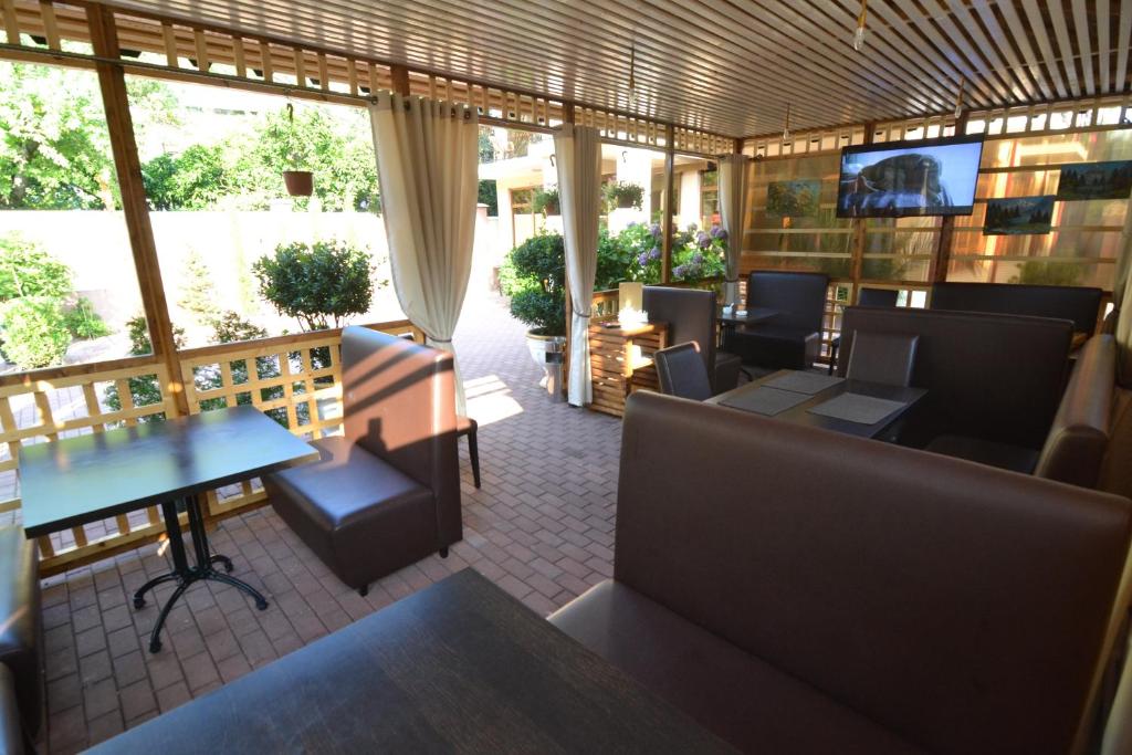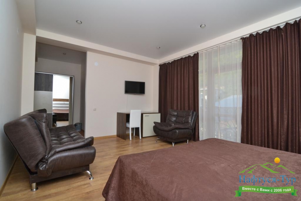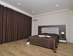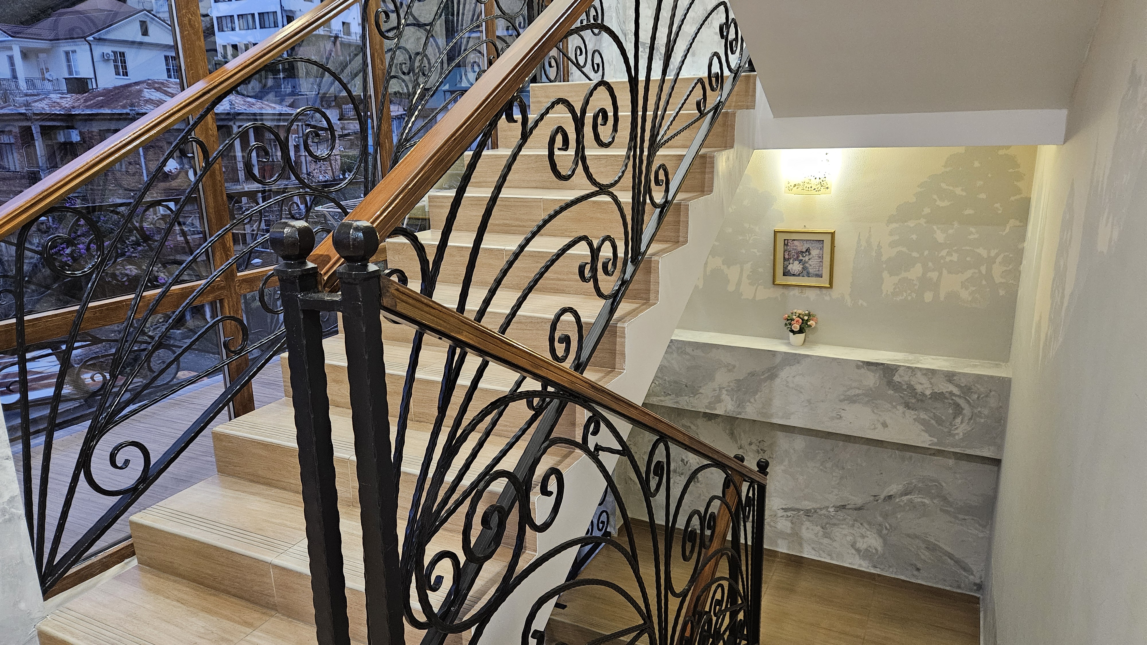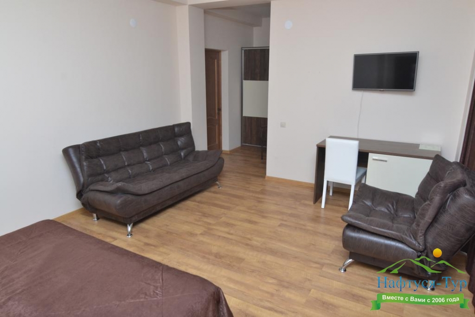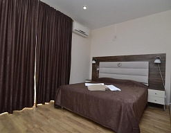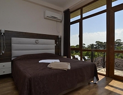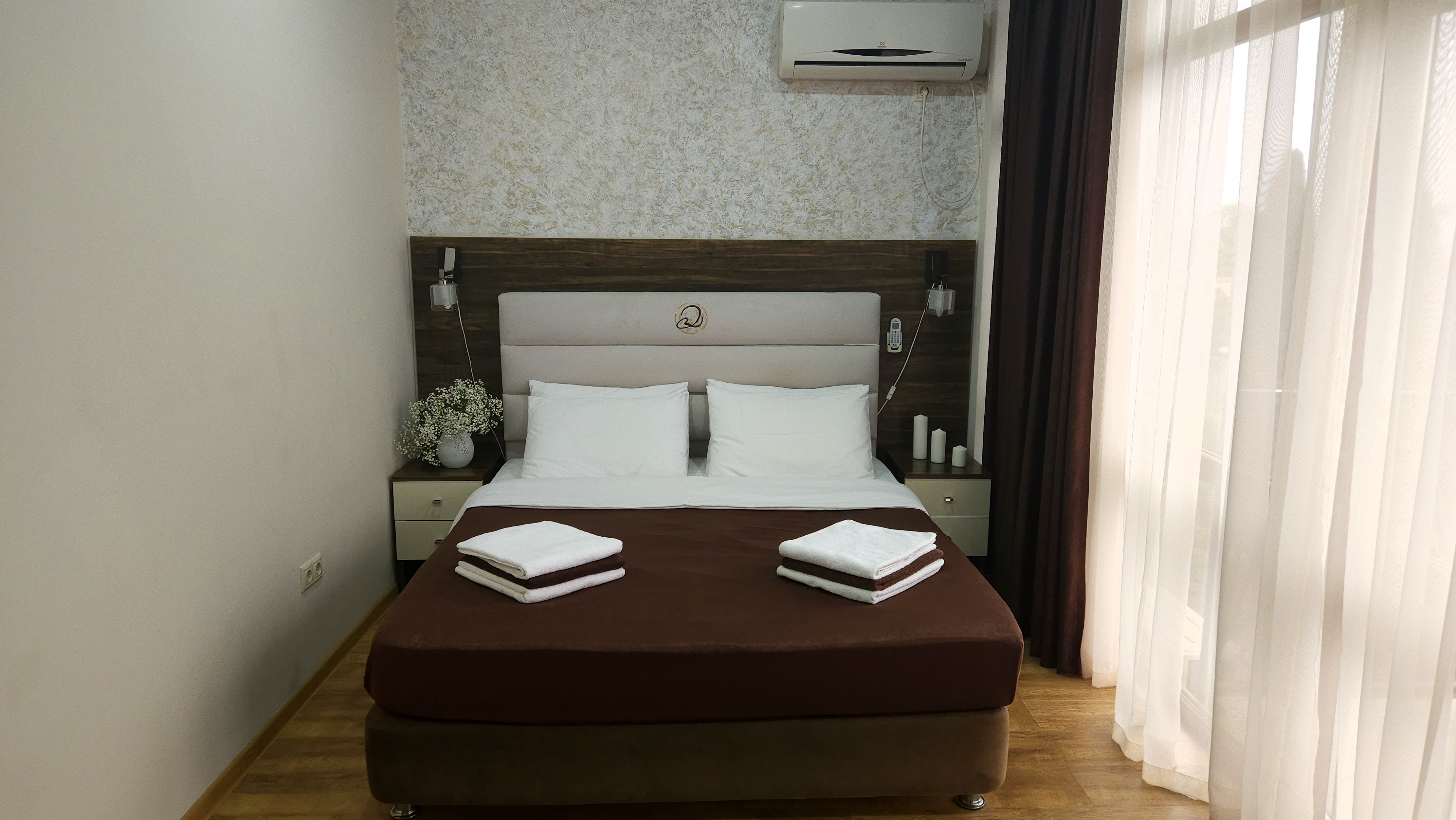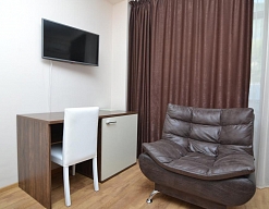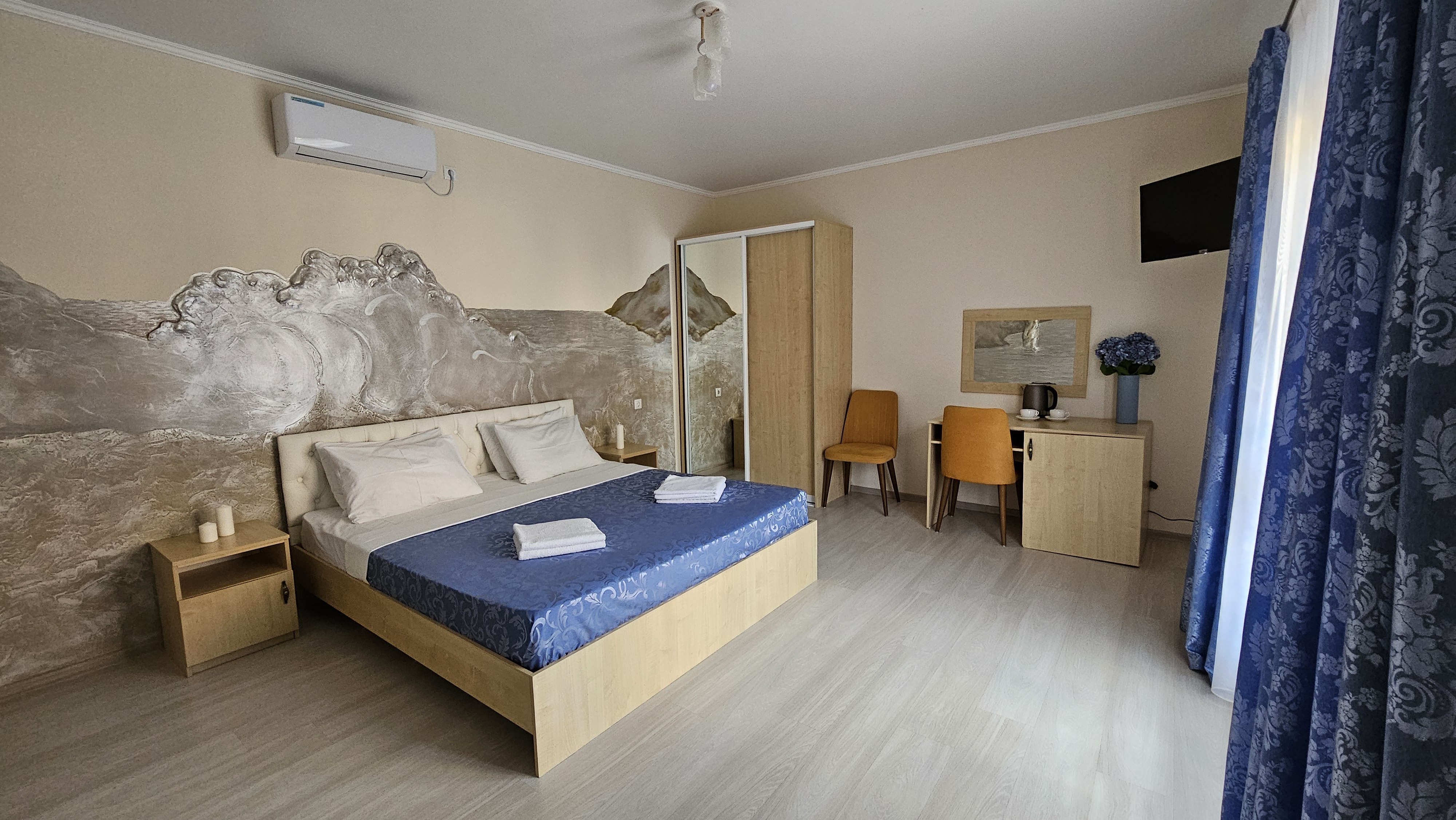 1. Плюсы: отель новый, это чувствуется и по номерам и по мебели - все безупречно от смесителей в раковинах (очень красивые) до постельного белья, оно белоснежно, полотенца меняют раз в 3-4 дня (мы отдыхали неделю, нам поменяли 1 раз). Территория отеля круглосуточно охраняется вневедомственной охраной. В холле или во дворе постоянно дежурит специалист. Персонал отеля все как один радушны и дружелюбны. Очень понравилось общаться с администратором Риммой, горничными Мартой и еще одной горничной, имени к сожалению не помню. Косметическая уборка номера протирка полов и вынос мусора каждый день (!) - девочки, спасибо! У нас в стоимость проживания входили завтраки. В очень стильном кафе каждый день бессменная Ирина. Она и накроет и выполнит любую просьбу. Большое ей спасибо. Столик в кафе закреплен за конкретным номером. Приходишь, садишься и тебе накрывают по стандартному меню (ни больше ни меньше): круглая булочка и кусочек масла, каша (меняется раз в 3 дня -это геркулес, рисовая, манная) и еще одно блюдо которое ежедневно чередуется - это или 2 блинчика со сметаной, или глазунья на 2 яйца, или омлет, или сырники. Чай, кофе каждый сам наливает на свое усмотрение из пакетиков. Дополнительно мы просили Иру и она приносила нам чашку молока, мы им кофе и чай разбавляли. Конечно не хватало сыра и овощей на завтрак (как пожелание). Есть WiFi!