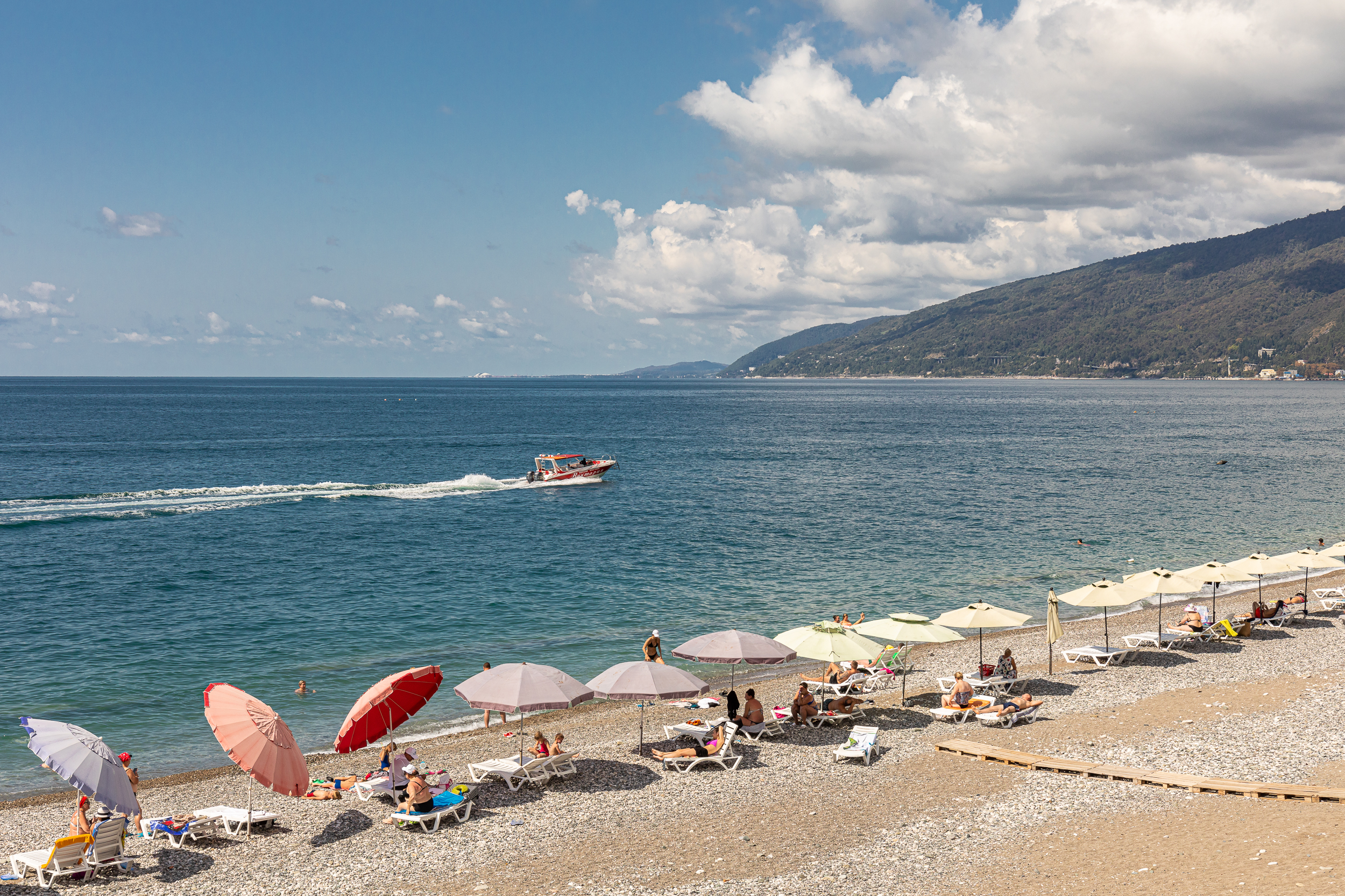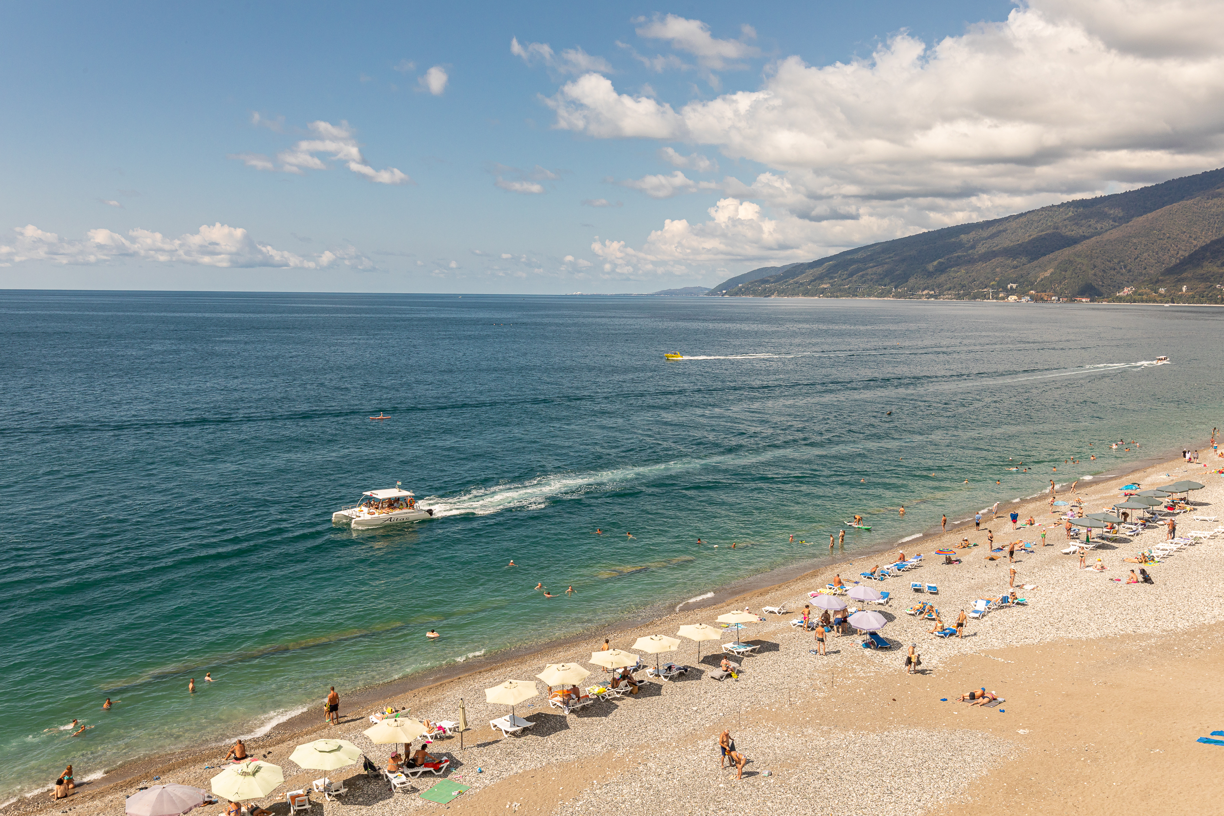 Только что вчера прилетели из Абхазии, жили в Руслане неделю...сначала заселились в номер с видом на горы, потом перешли в номер с видом на море...И тот и другой вид просто супер! Большое панорамное окно вовсю стену, лежишь на кровати и смотришь как плещутся волны.