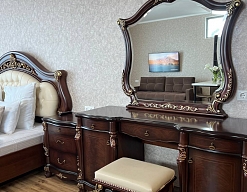 вешалка, диван раскладной, зеркало, кровать двуспальная, кухонная мебель, прикроватные тумбочки, стол, столик туалетный, стулья, шкаф