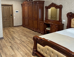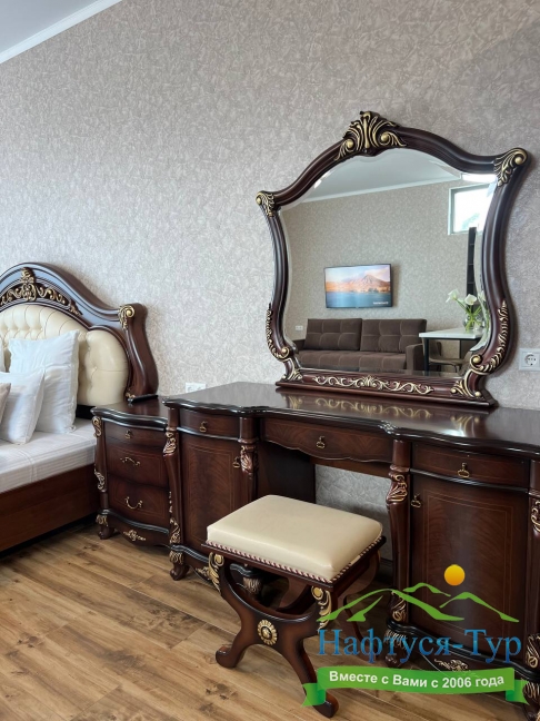 вешалка, зеркало, кровати односпальные /одна двуспальная кровать, кровать односпальная, кухонная мебель, прикроватные тумбочки, стол, столик туалетный, стулья, шкаф