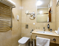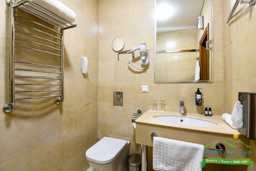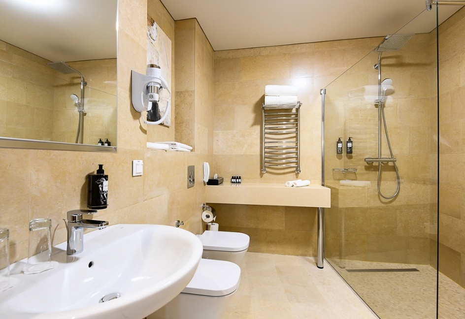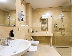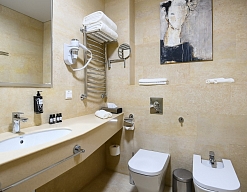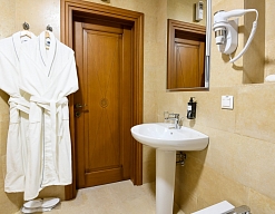 биде, с душевой кабиной, тапочки, туалетные принадлежности, фен, халат