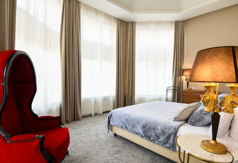 кресло, кровати односпальные /одна двуспальная кровать, прикроватные столики, стол, стул, шкаф