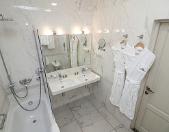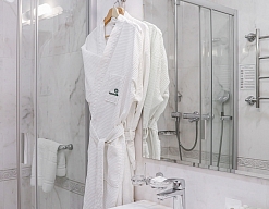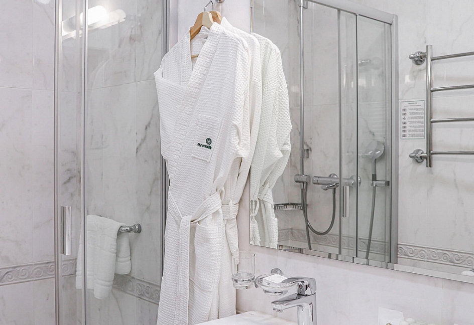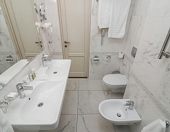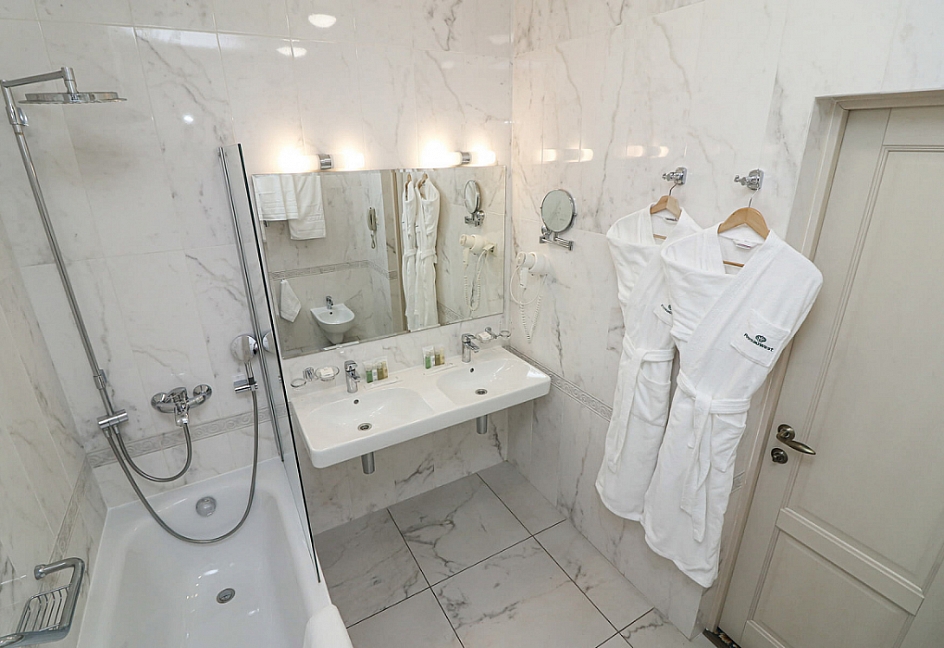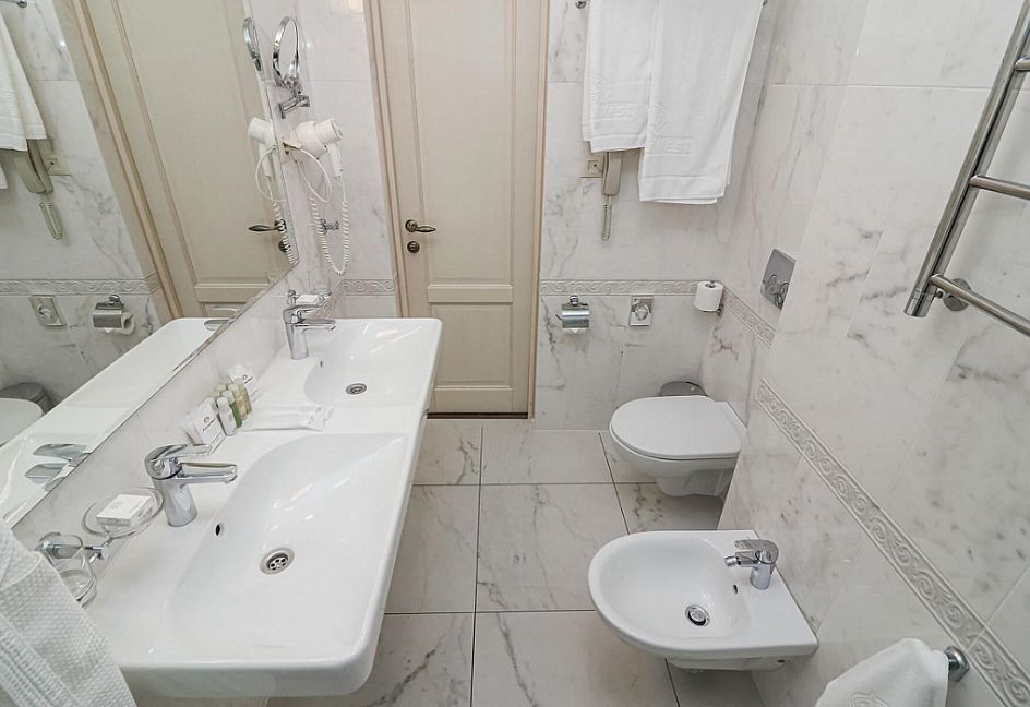 биде, с ванной, тапочки, туалетные принадлежности, фен, халат