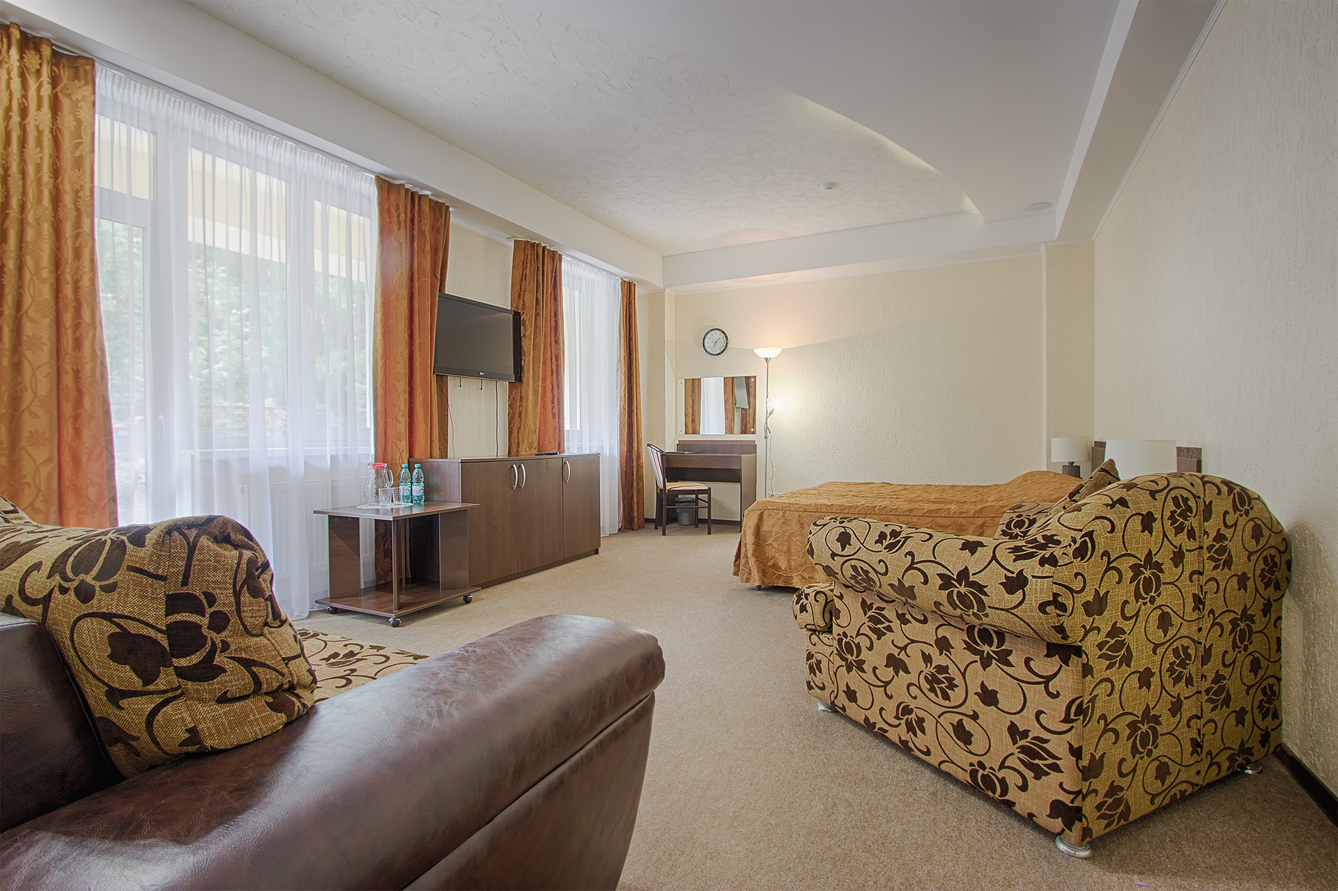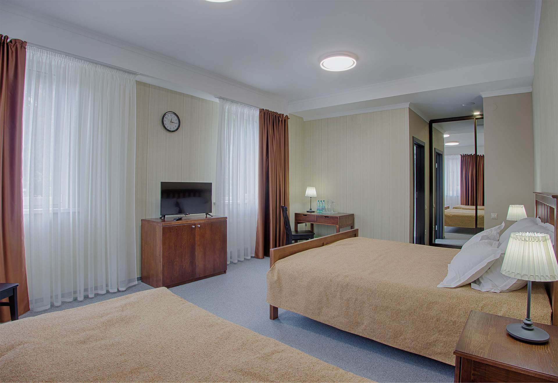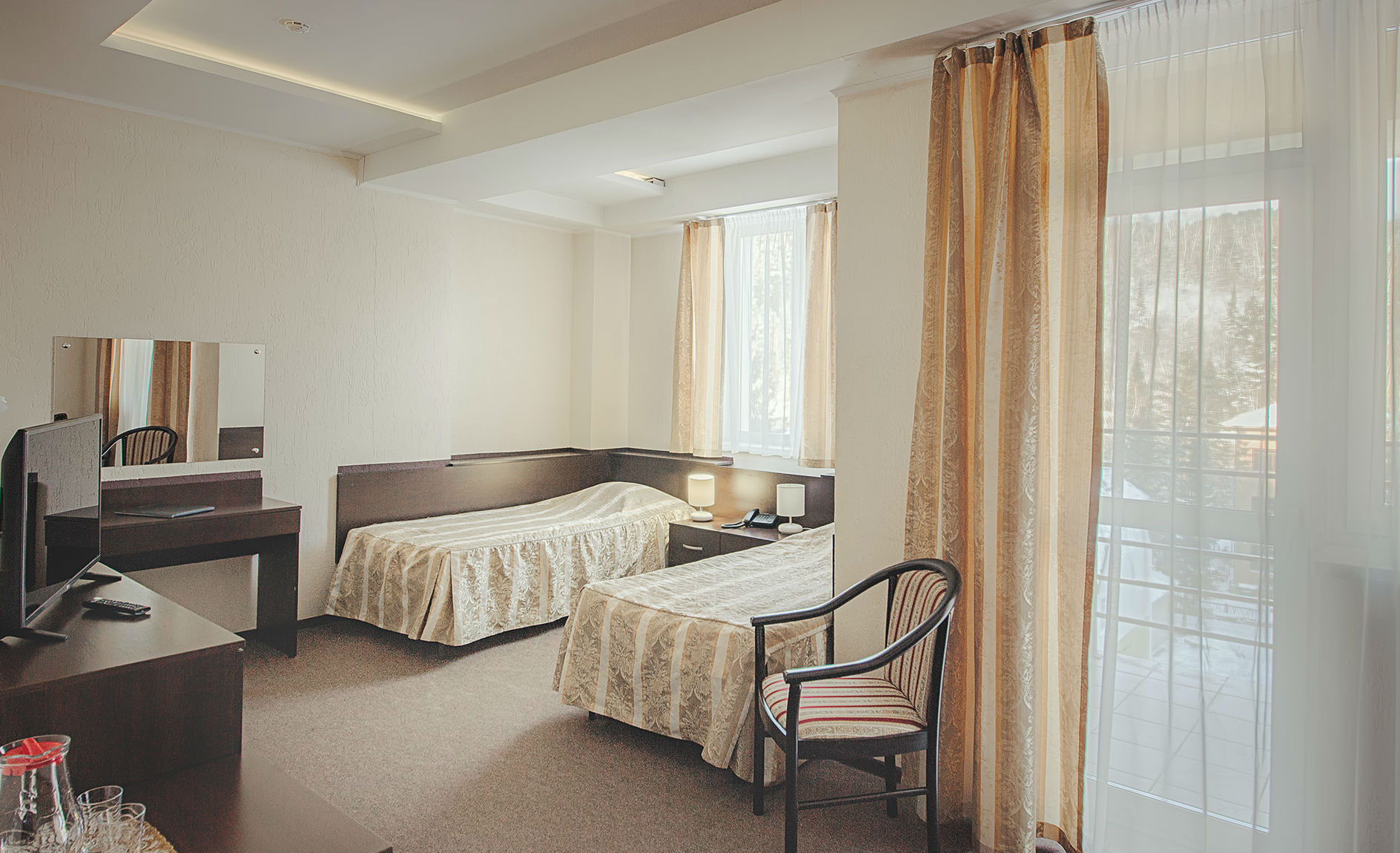 Комфортабельные номера санатория оборудованы современной мебелью и техникой, обеспечивая уют и комфорт проживания. Из окон открываются великолепные виды на горы и леса Белокурихи, что делает проживание здесь особенно приятным и релаксирующим.