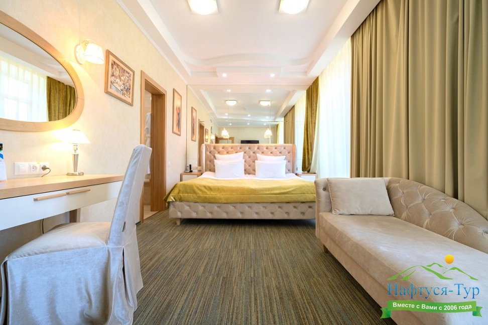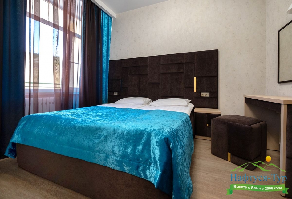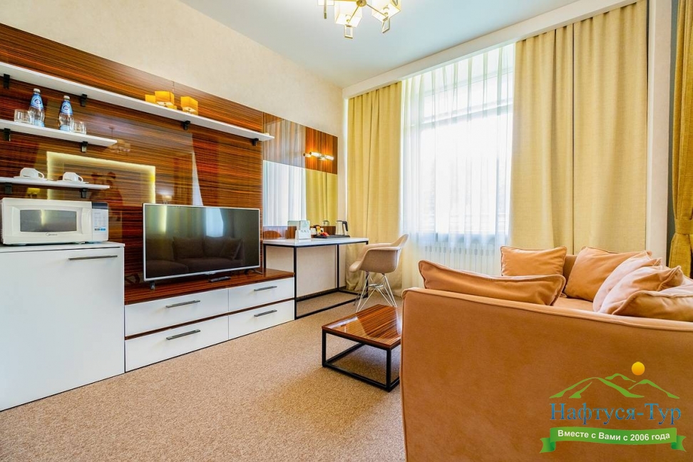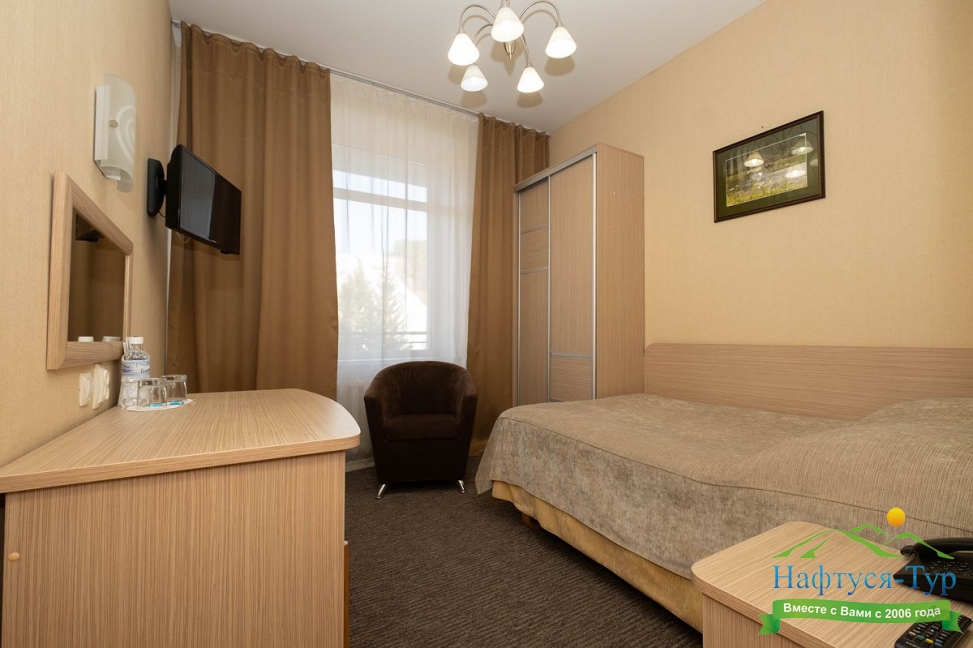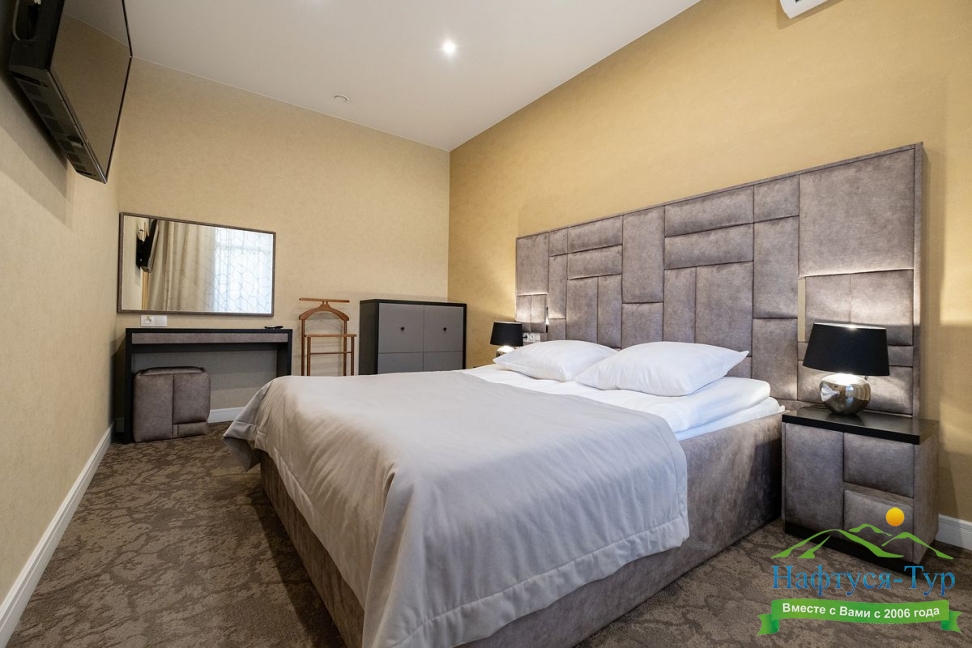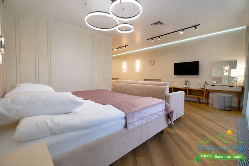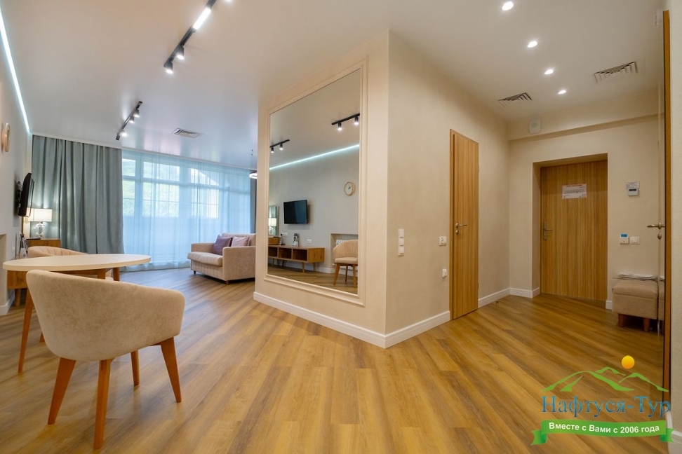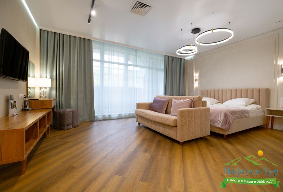 Номерной фонд санатория варьируется от уютных стандартных номеров до просторных люксов с панорамным видом на горы. Каждый номер оборудован всем необходимым для комфортного отдыха: мягкая мебель, теплые полы, современная сантехника, телевизор и бесплатный Wi-Fi.