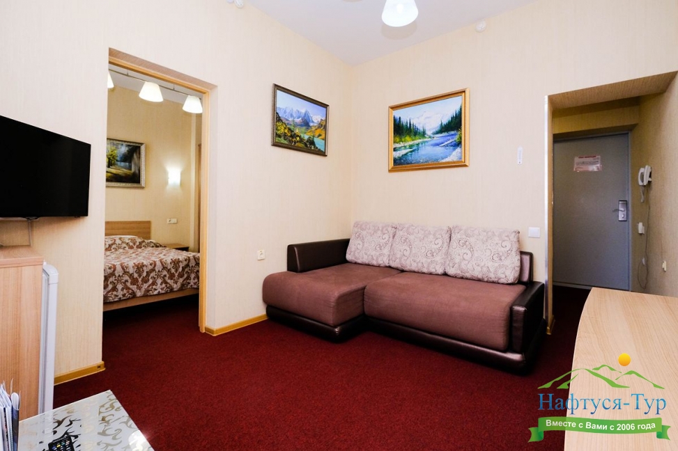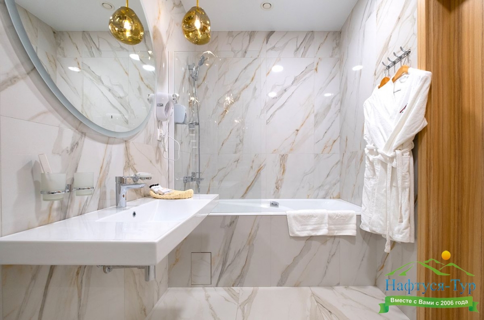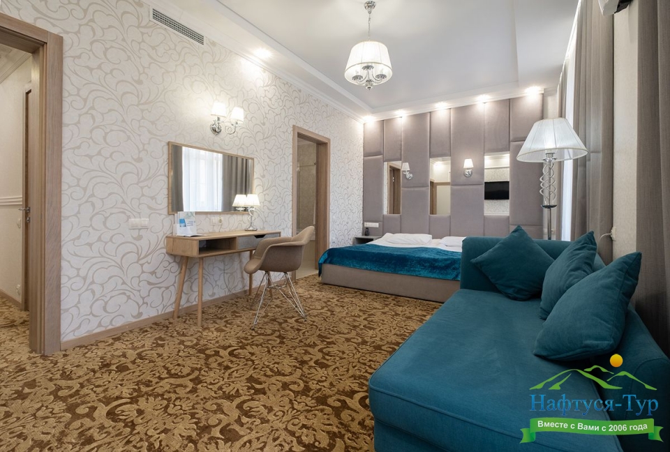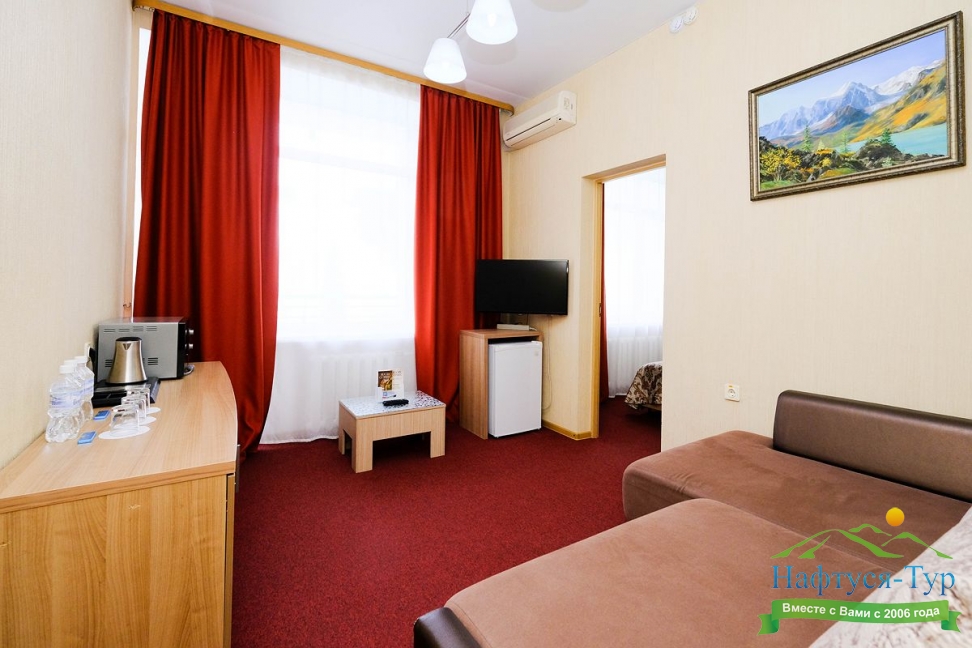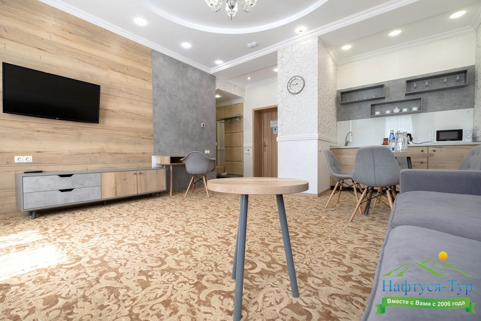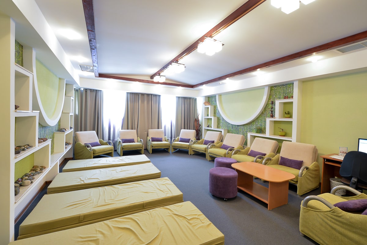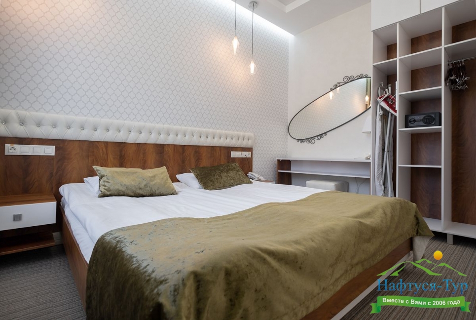 Номерной фонд санатория варьируется от уютных стандартных номеров до просторных люксов с панорамным видом на горы. Каждый номер оборудован всем необходимым для комфортного отдыха: мягкая мебель, теплые полы, современная сантехника, телевизор и бесплатный Wi-Fi.