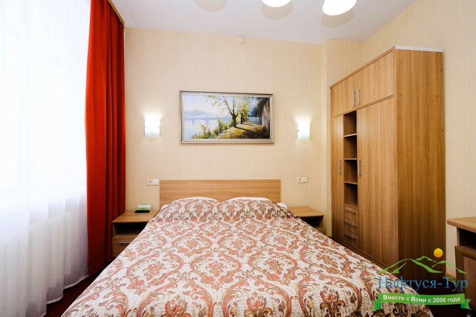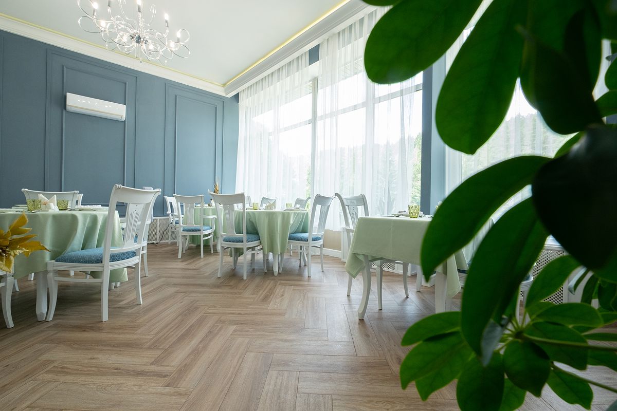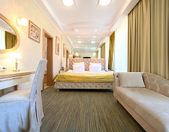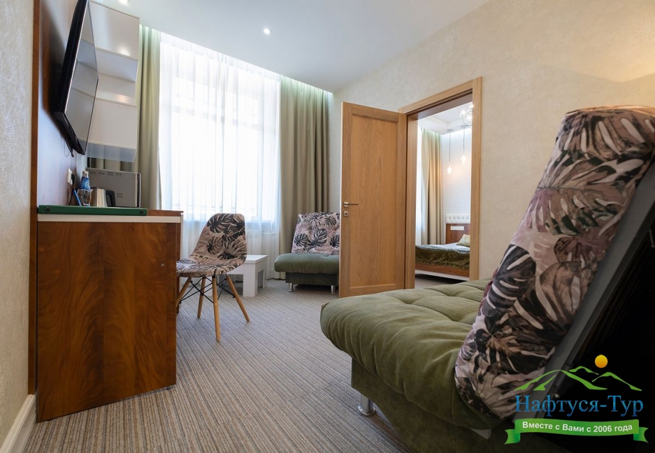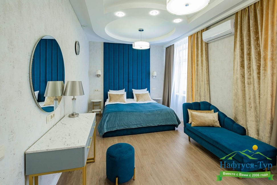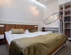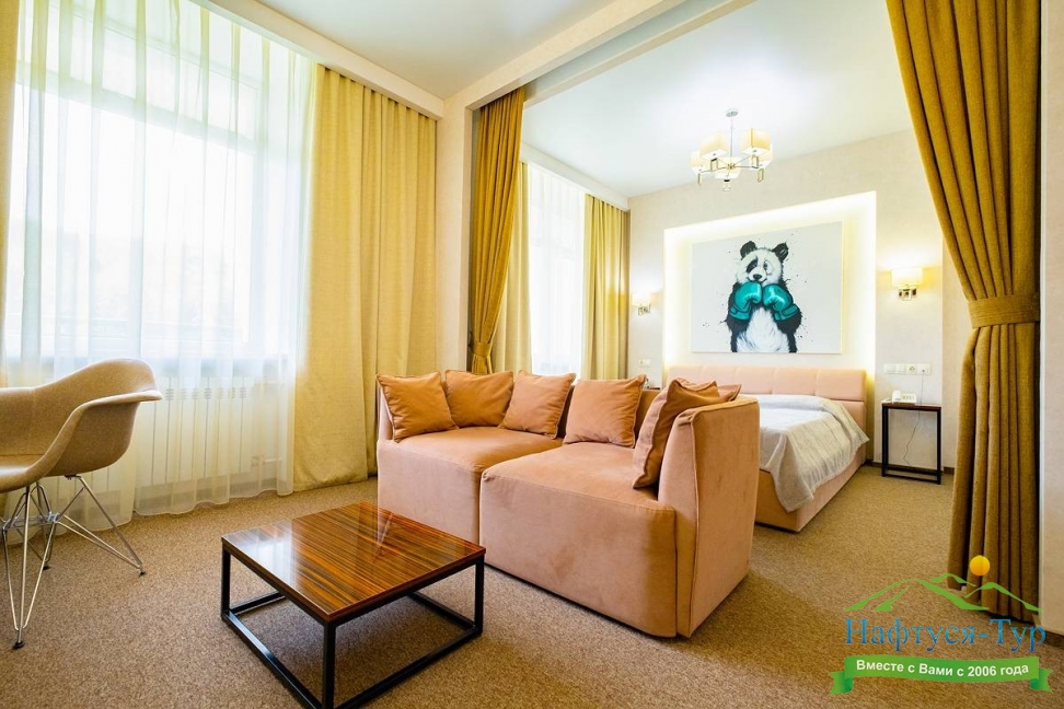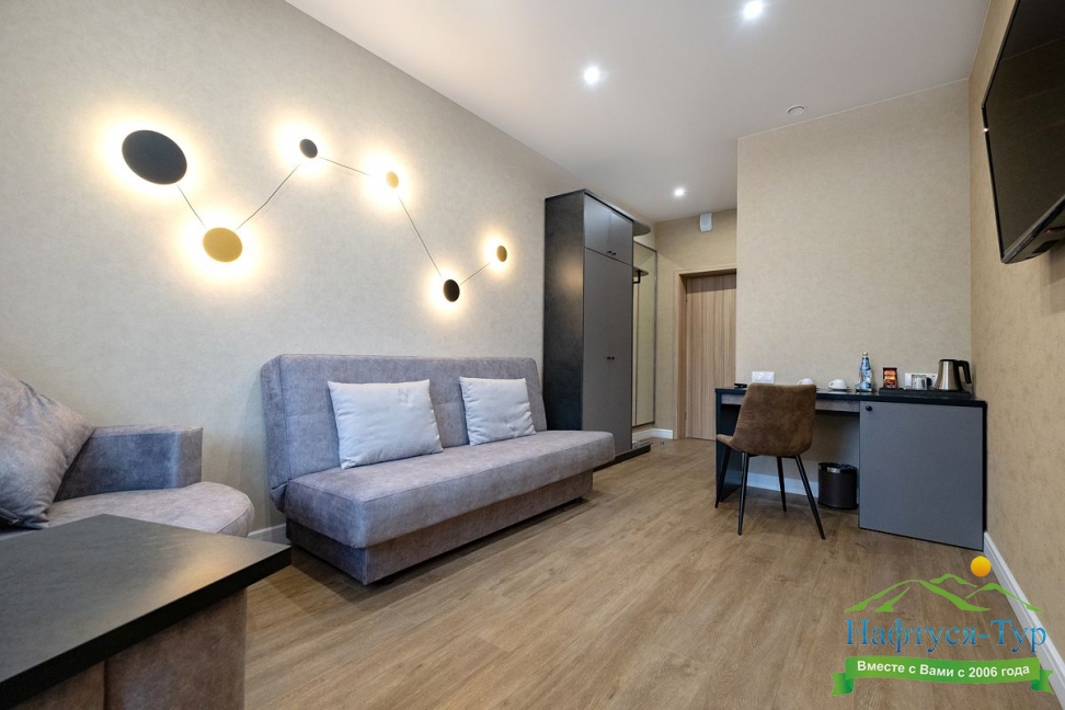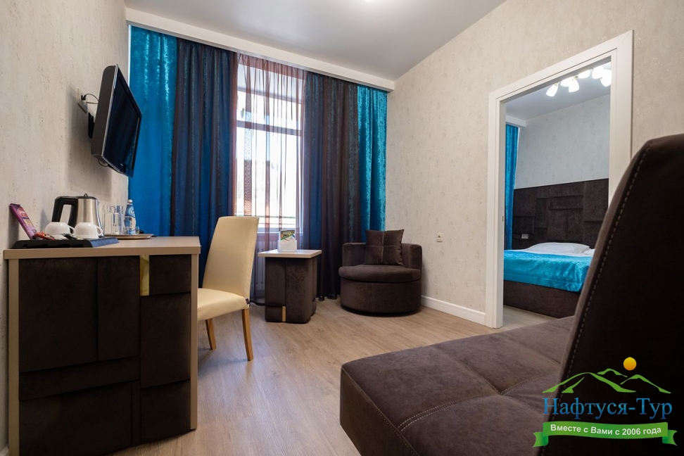 Номерной фонд санатория варьируется от уютных стандартных номеров до просторных люксов с панорамным видом на горы. Каждый номер оборудован всем необходимым для комфортного отдыха: мягкая мебель, теплые полы, современная сантехника, телевизор и бесплатный Wi-Fi.