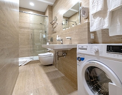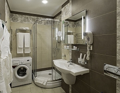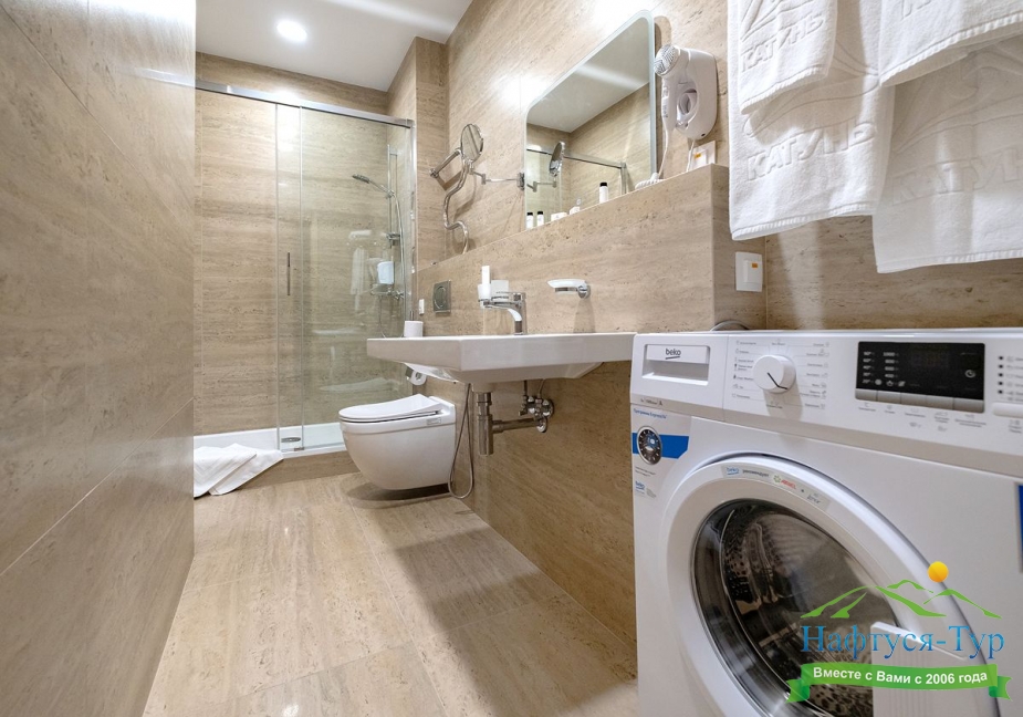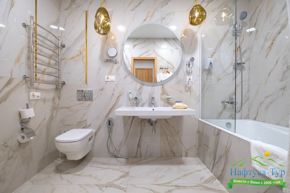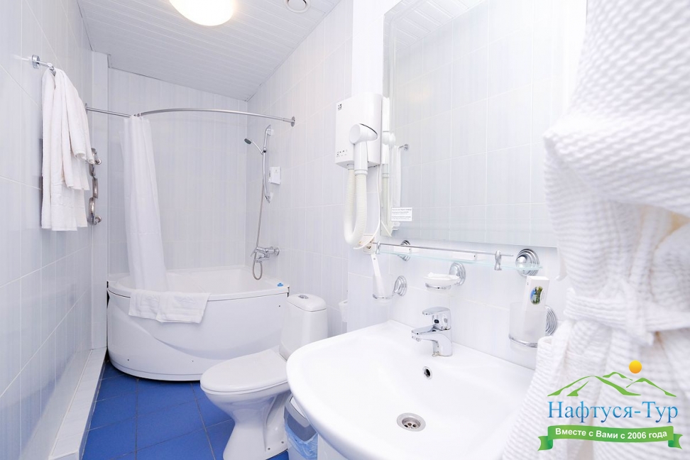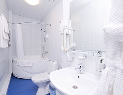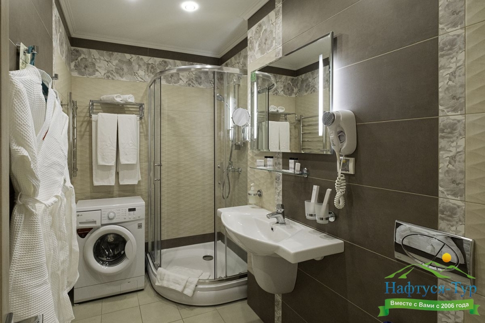 биде, с душевой кабиной, тапочки, туалетные принадлежности, фен, халат