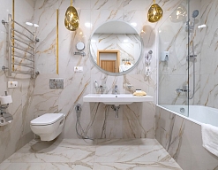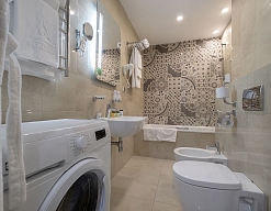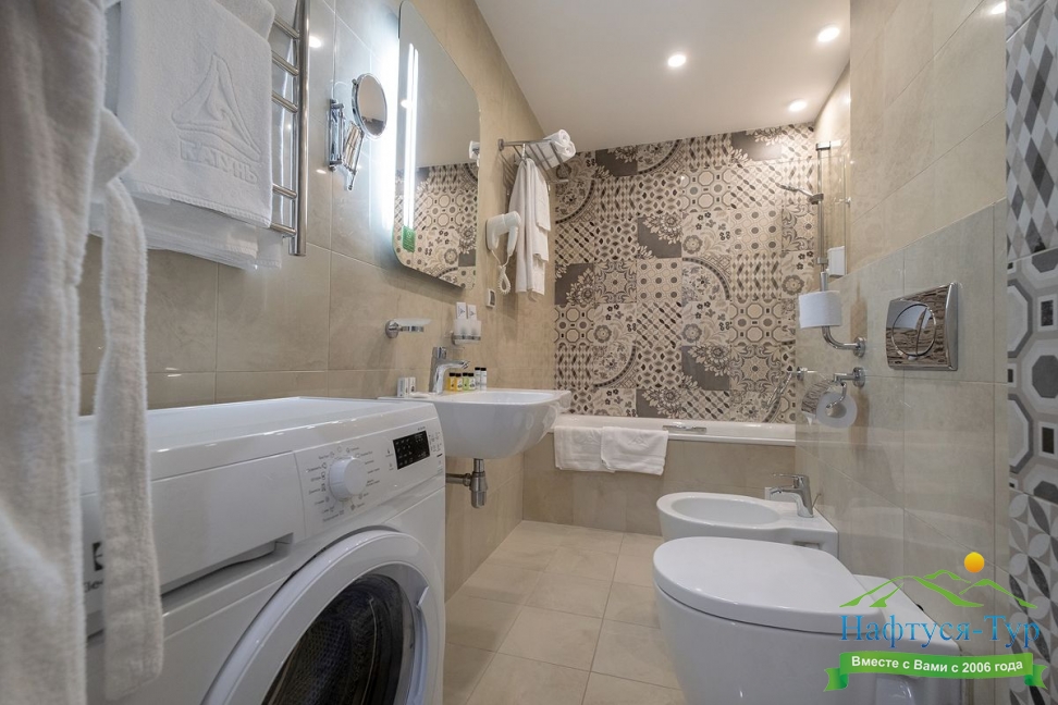 биде, с ванной, тапочки, туалетные принадлежности, фен, халат