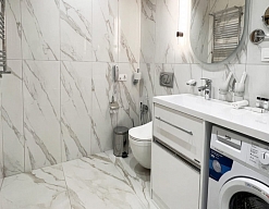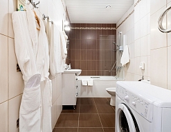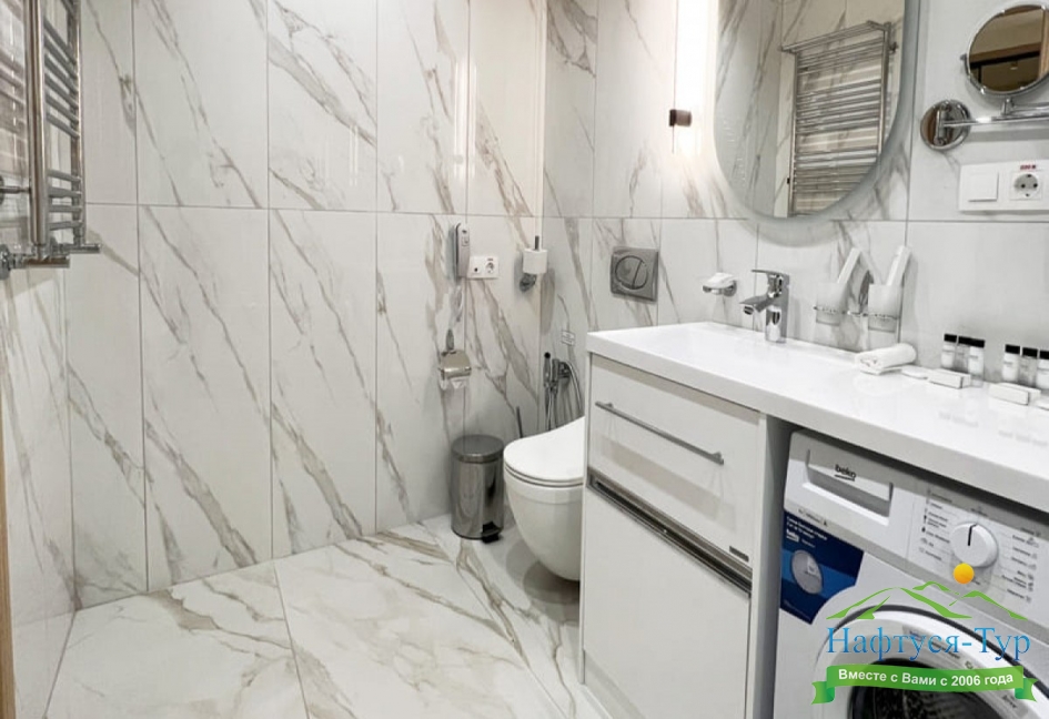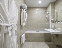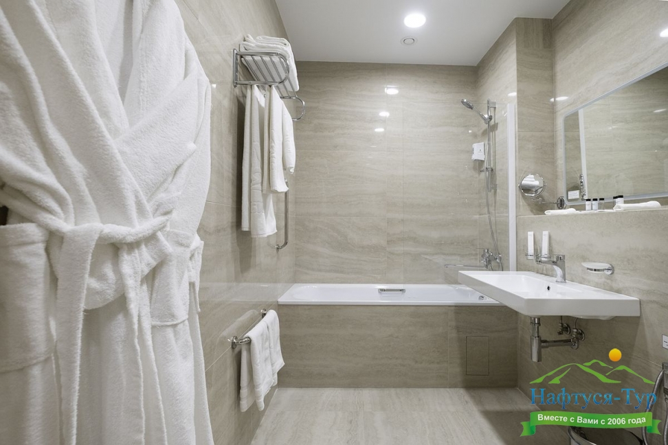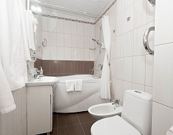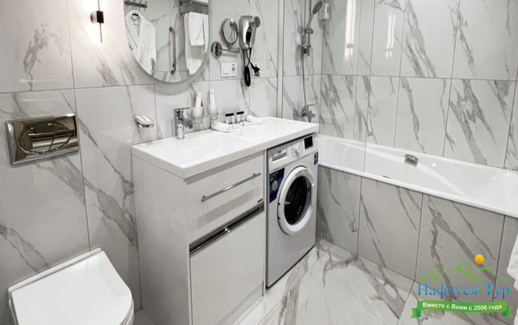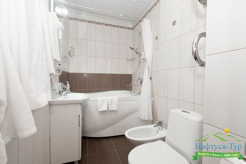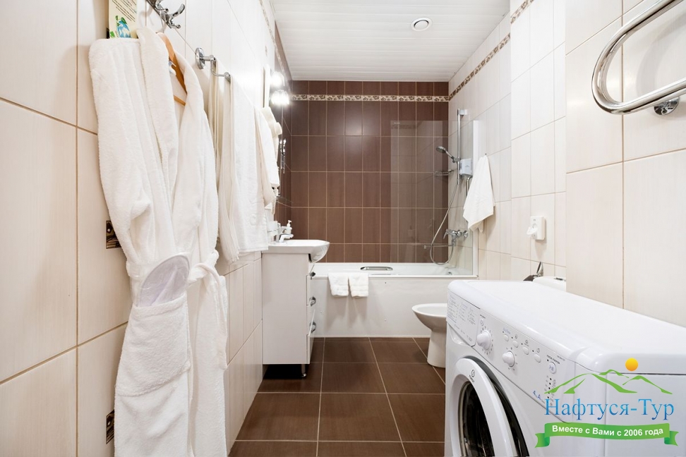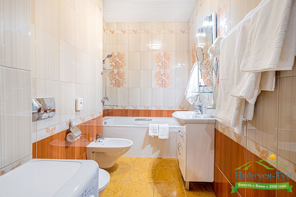 биде, с ванной, тапочки, туалетные принадлежности, фен, халат