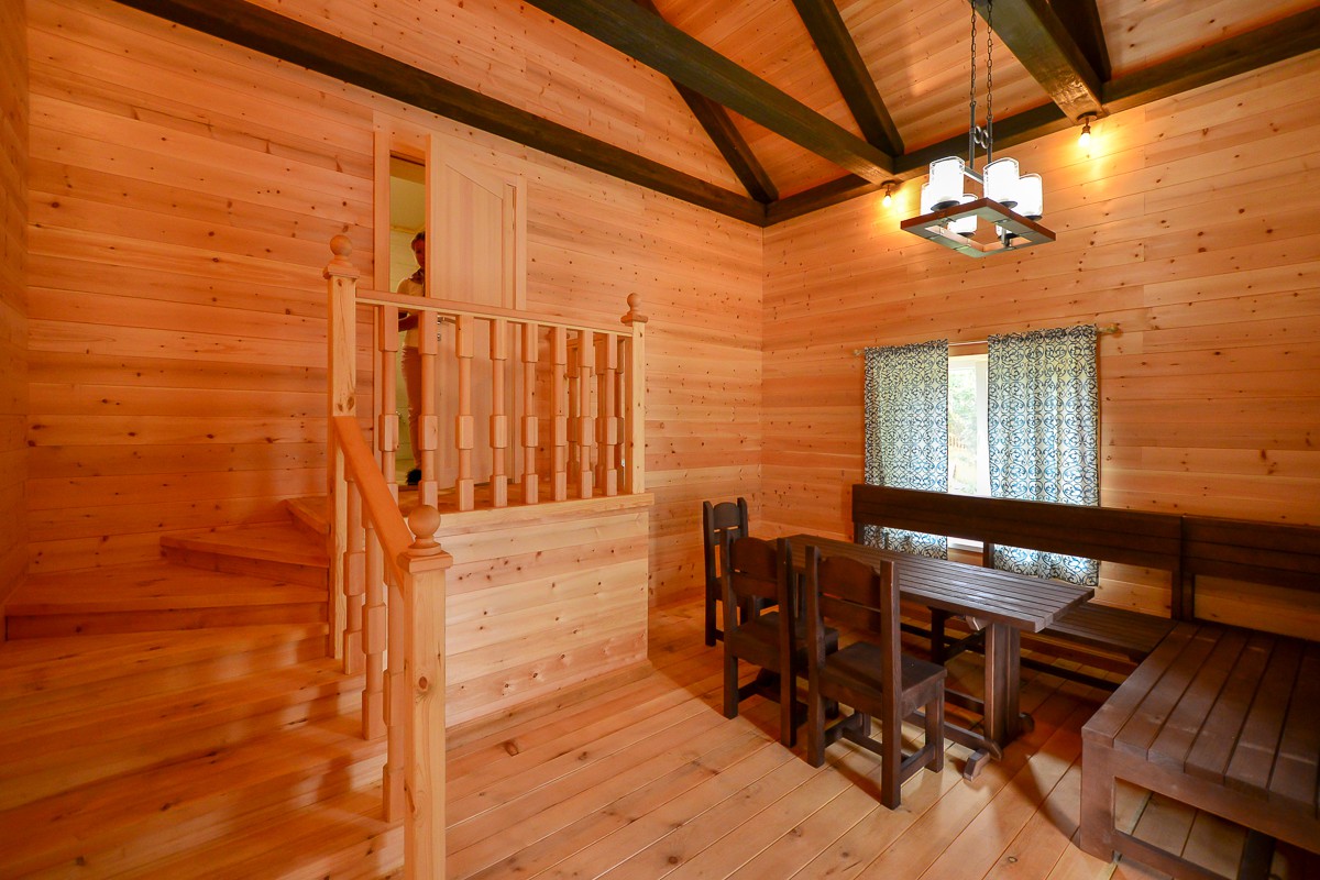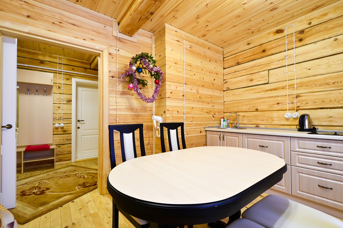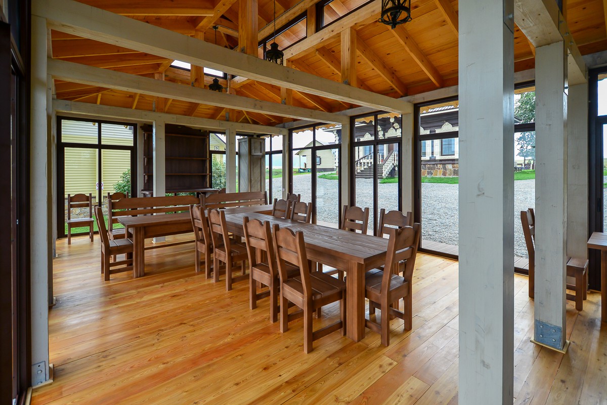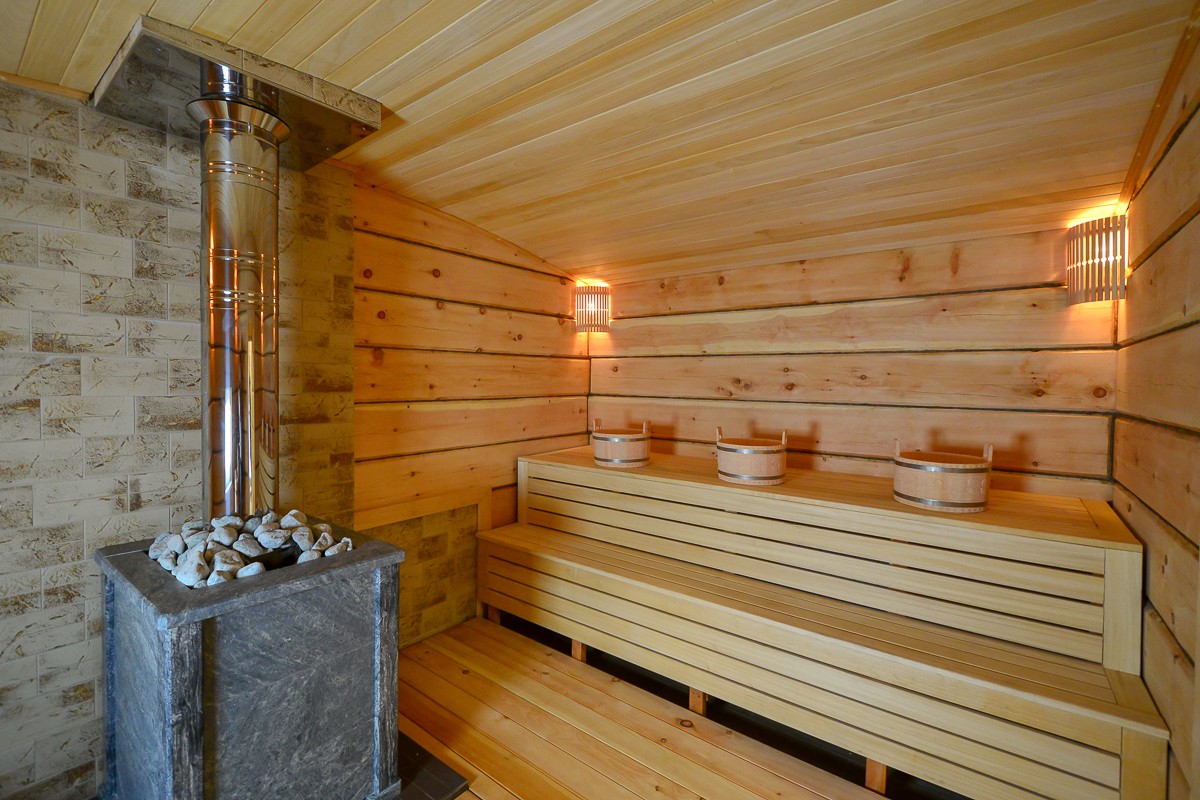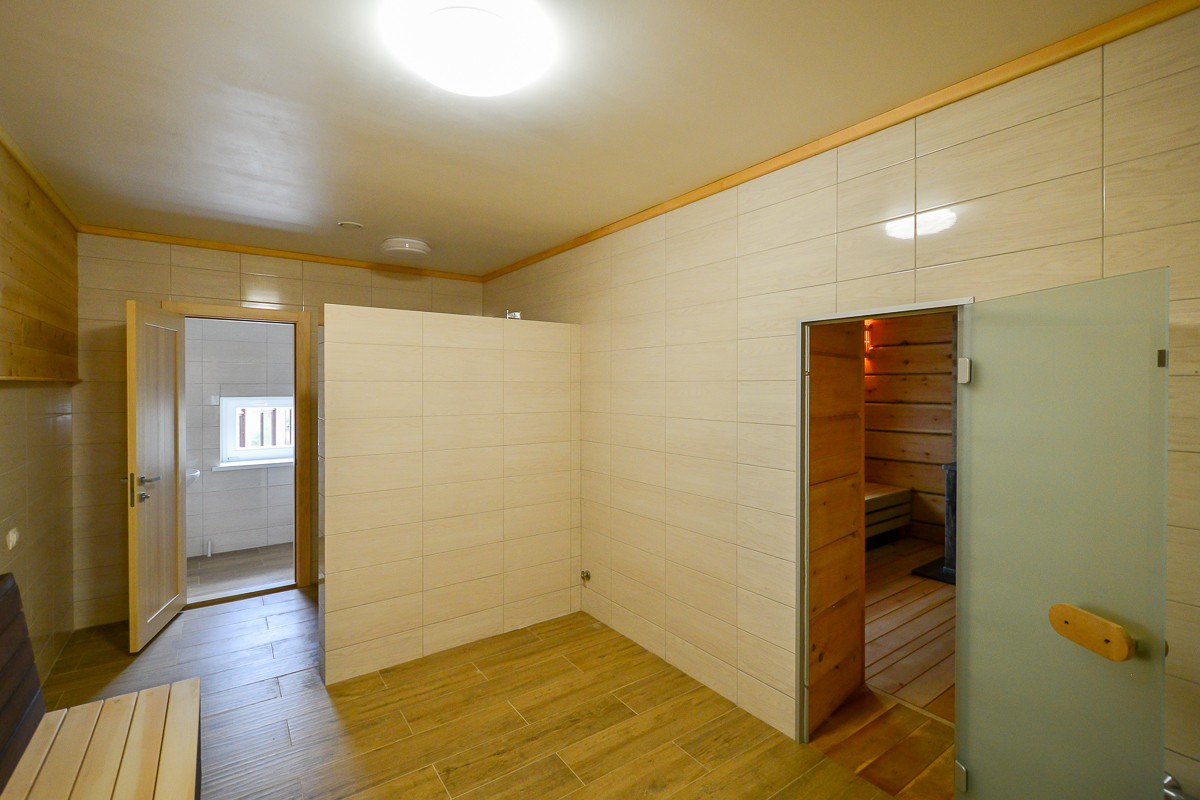 Большая парная, моечная, банкетный зал. Баня рассчитана на большую компанию. Здесь хорошо попариться после активного дня, а после порелаксировать в зоне отдыха. Имеется терраса с видом на озеро и горы.