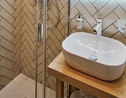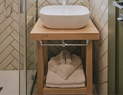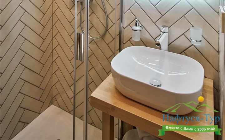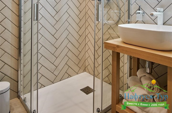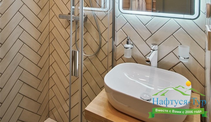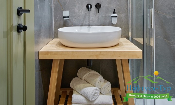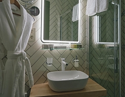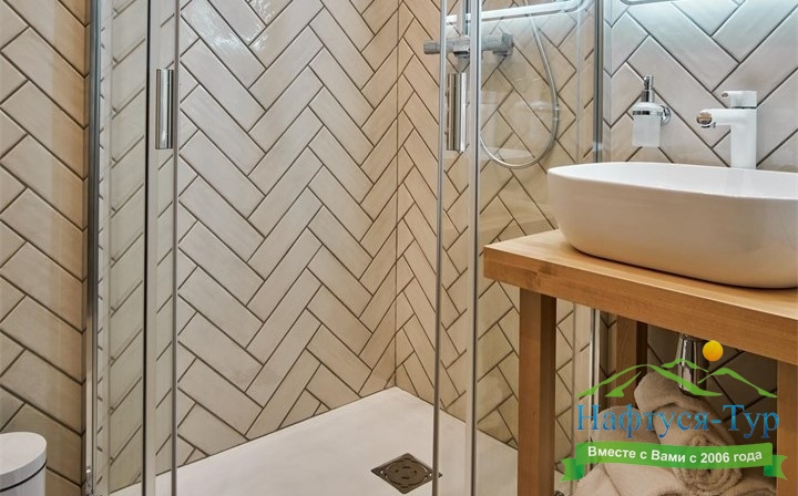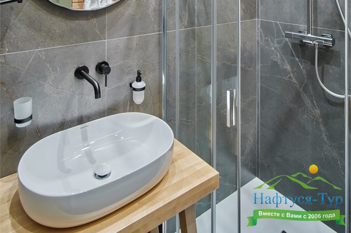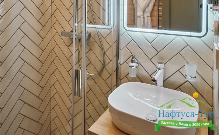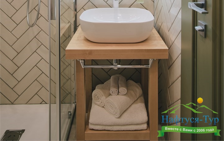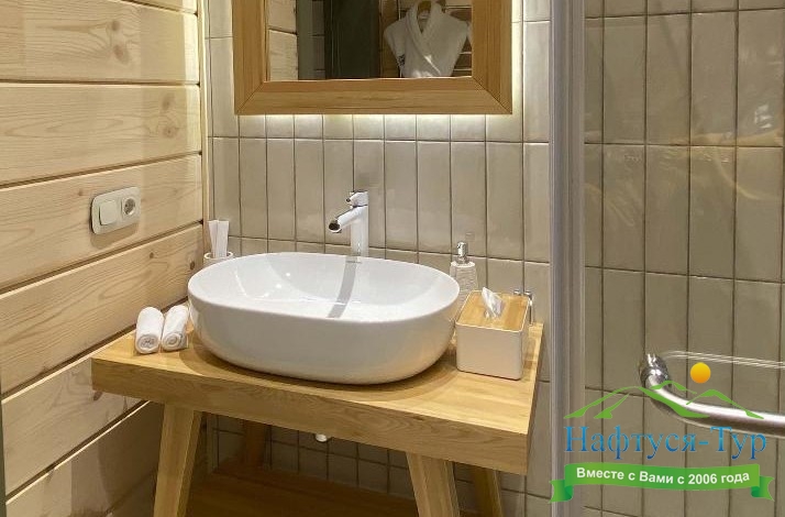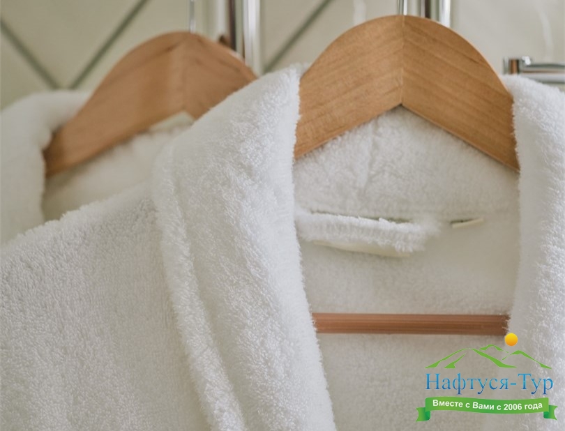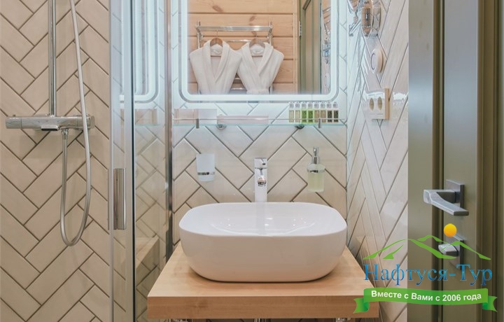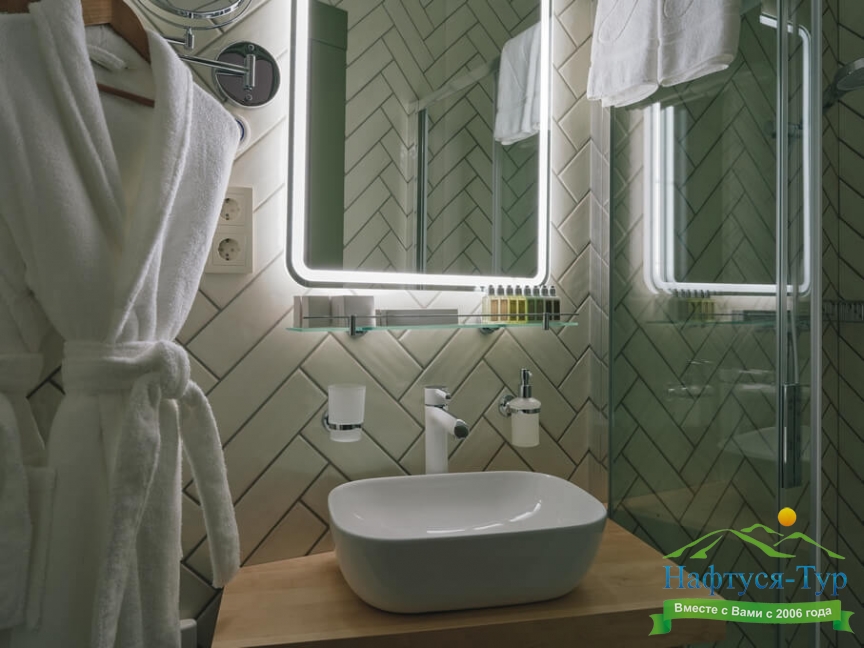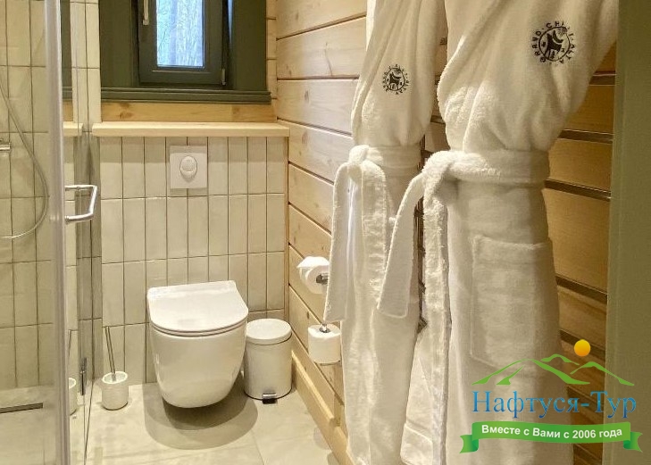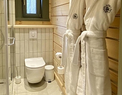 с душевой кабиной, тапочки, туалетные принадлежности, фен, халат