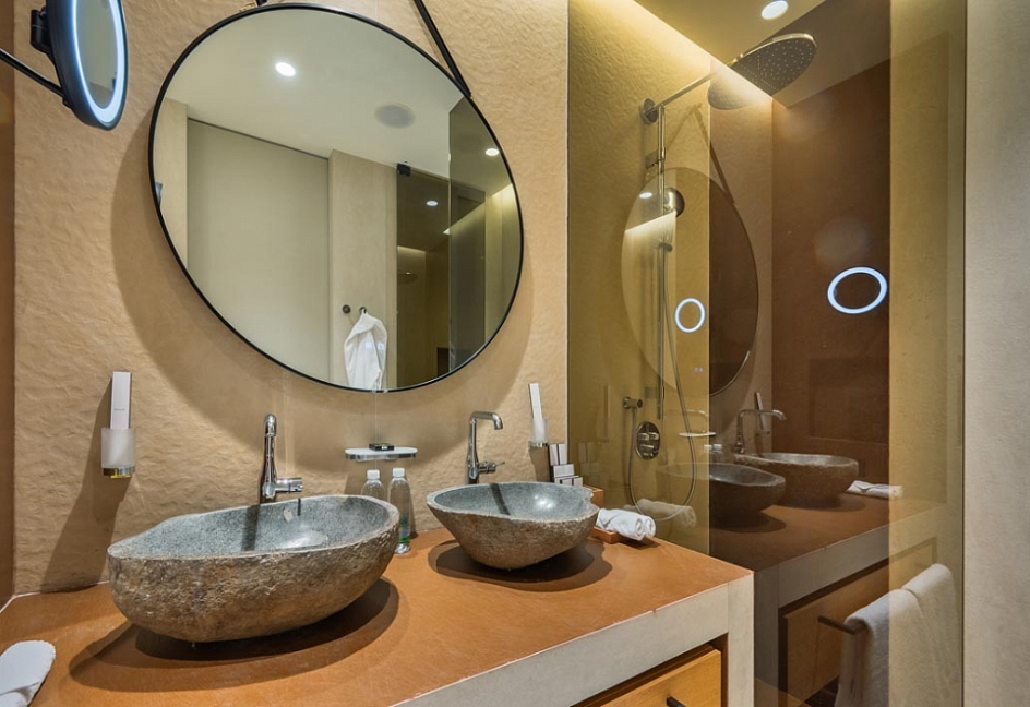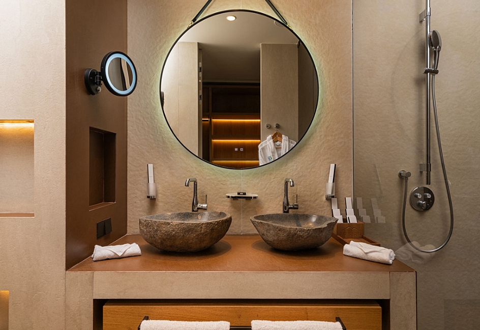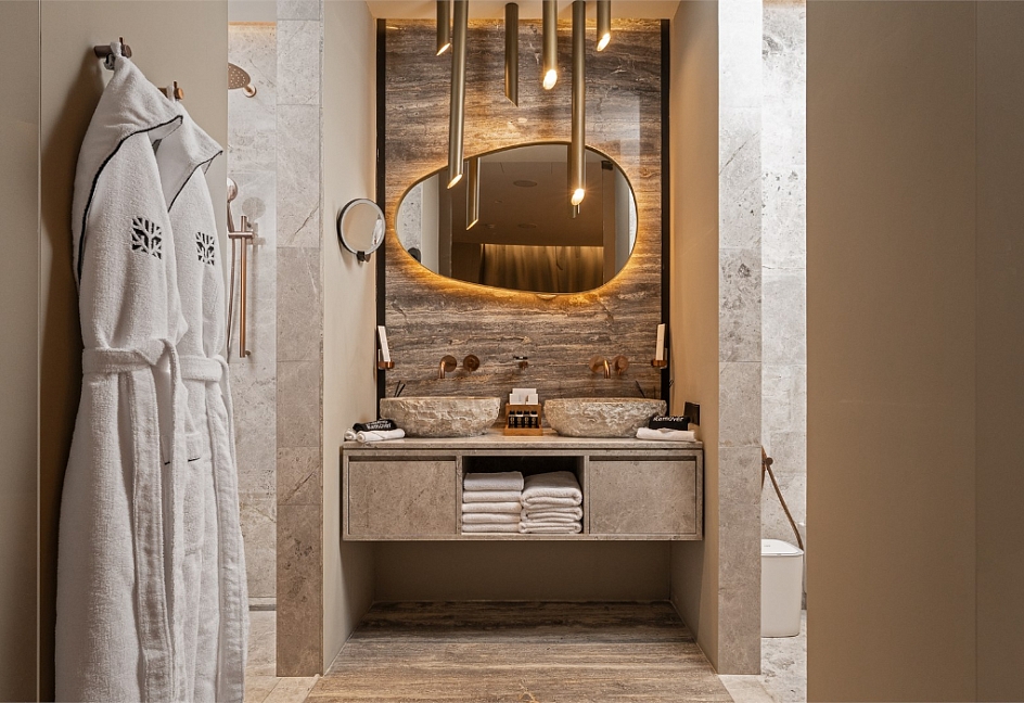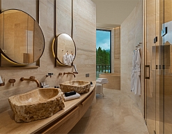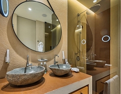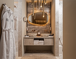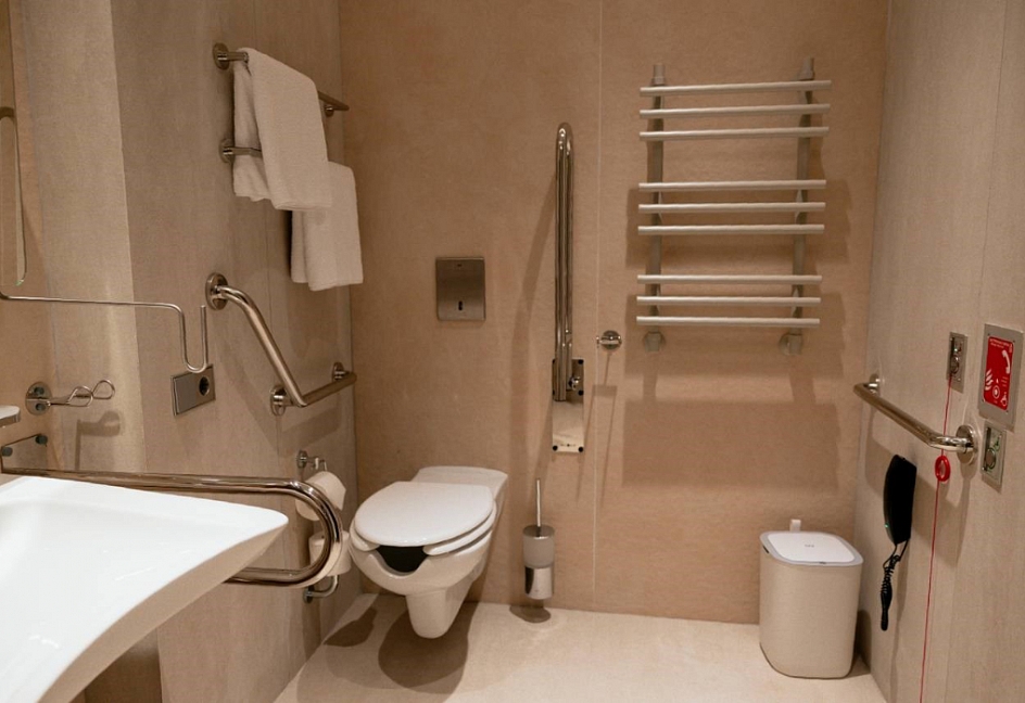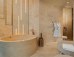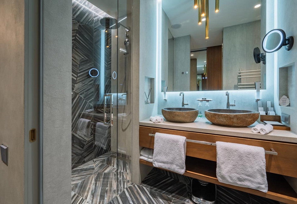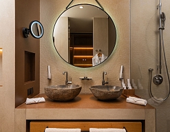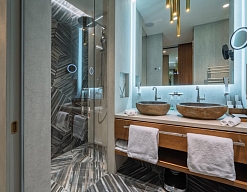 с душем, тапочки, туалетные принадлежности, фен, халат