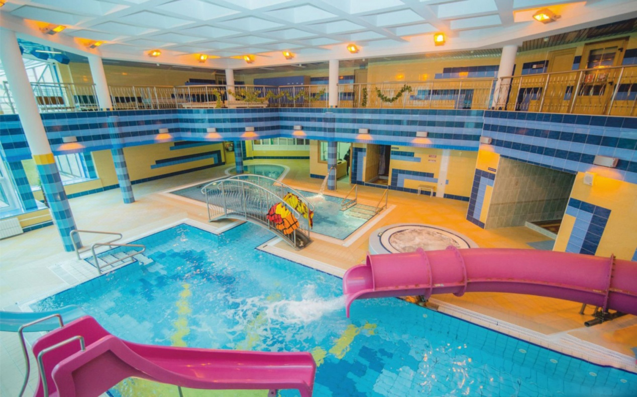 Он представляет собой современный аквапарк под крышей, где предусмотрены все меры безопасности для купания детей и взрослых.