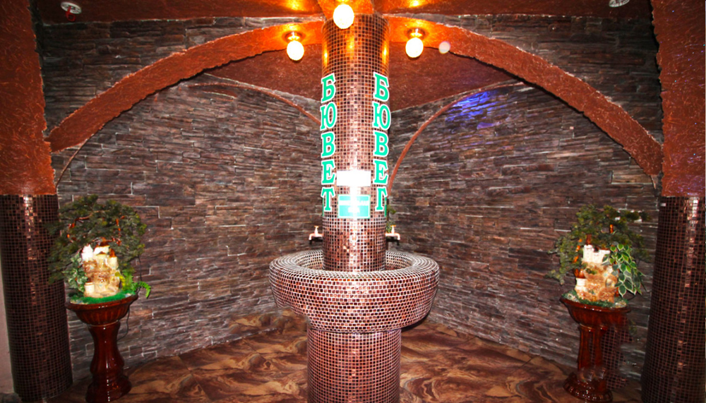 - собственный бювет, рассольная и сульфатно-кальциевая вода