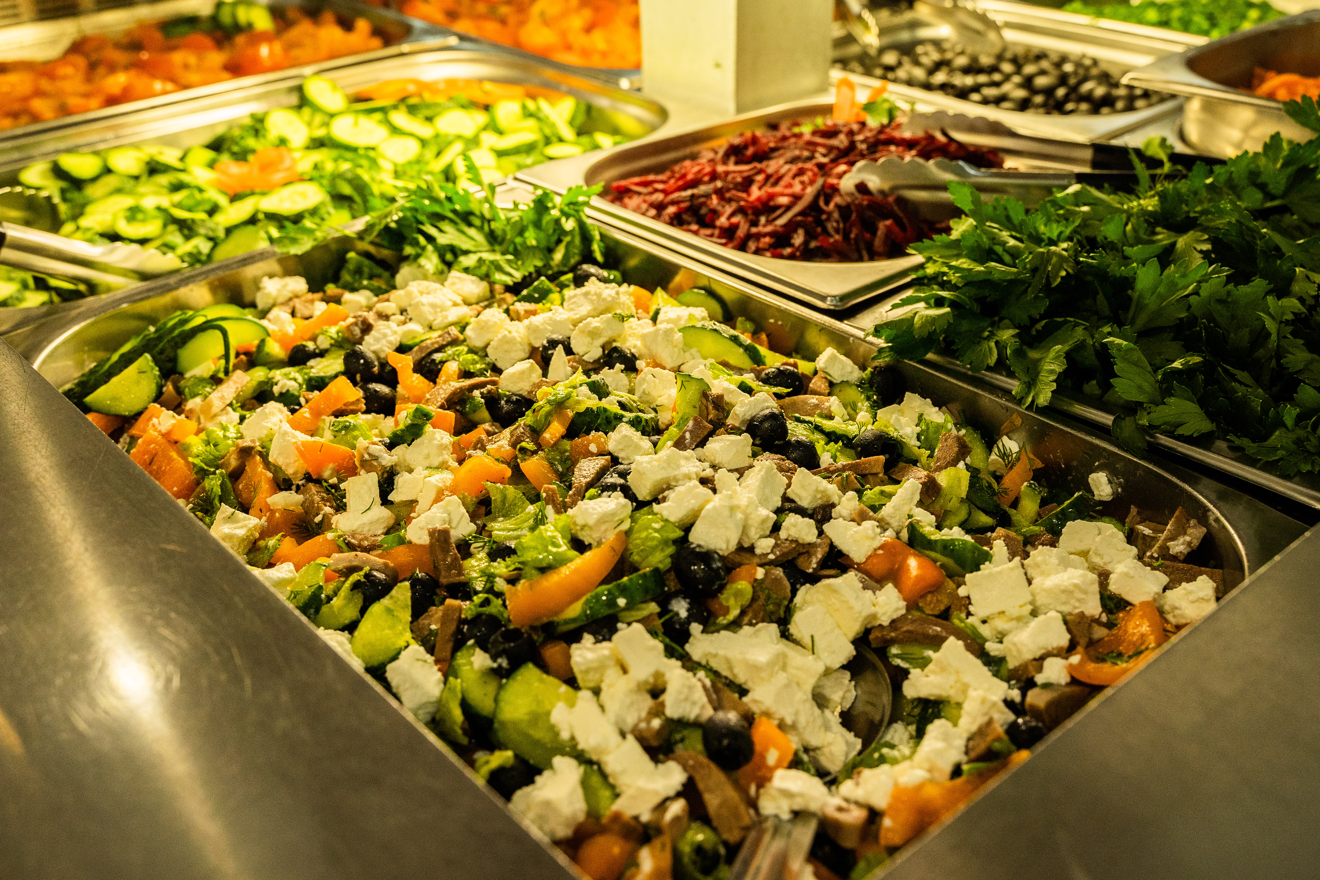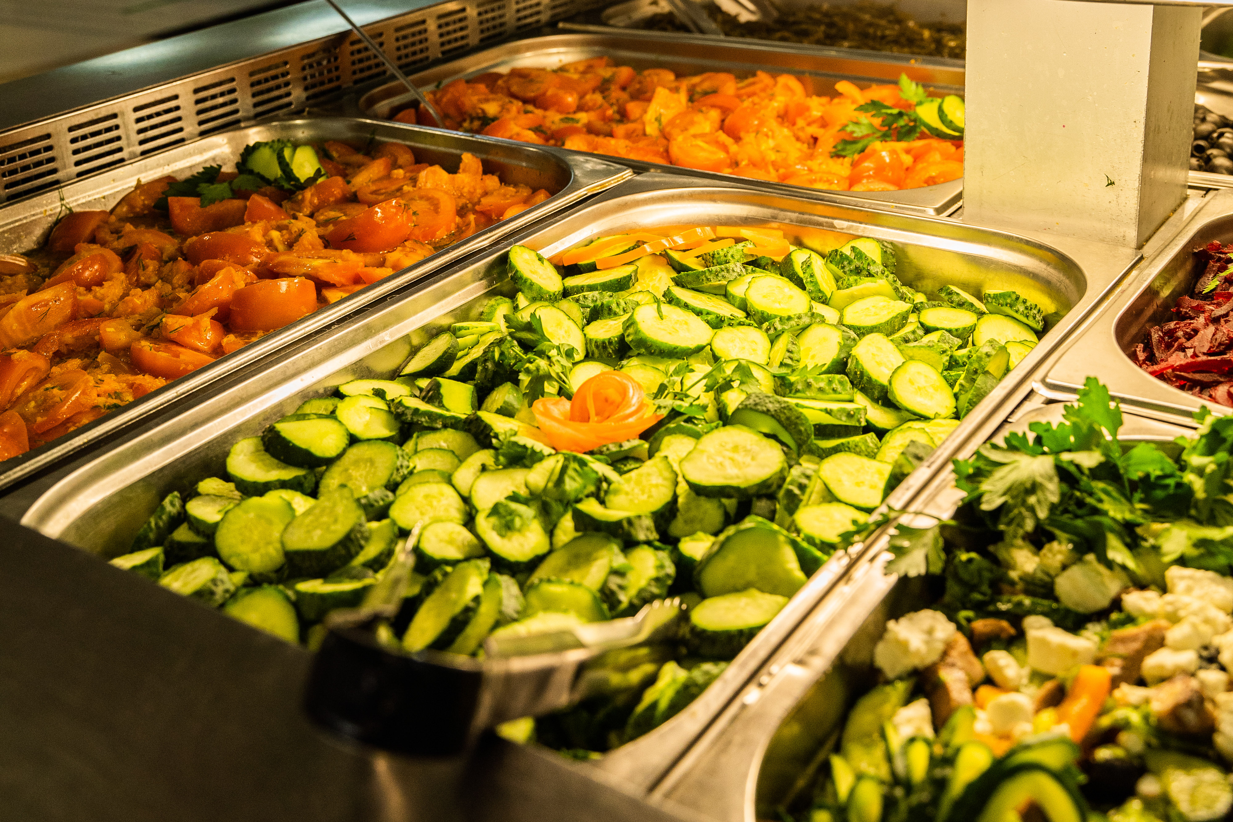 - Разнообразный шведский стол с большим количеством овощей и фруктов.