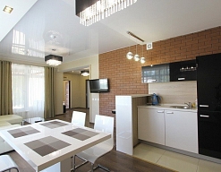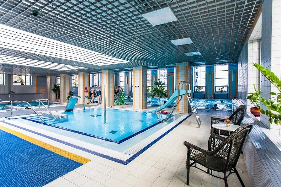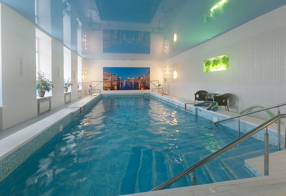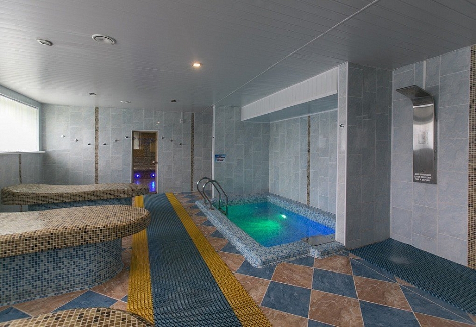 Комплекс включает: бассейн 22х11 (220 кв.м) оздоровительный с гидромассажными установками, глубина до 1,5 м, детский бассейн с горкой , гидромассажный бассейн, русскую парную, финскую сауну, турецкий хамам, комнату льда, купель, минибар.
