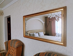 вешалка, диван, зеркало, кровать двуспальная, прикроватные тумбочки, стол, стулья, шкаф