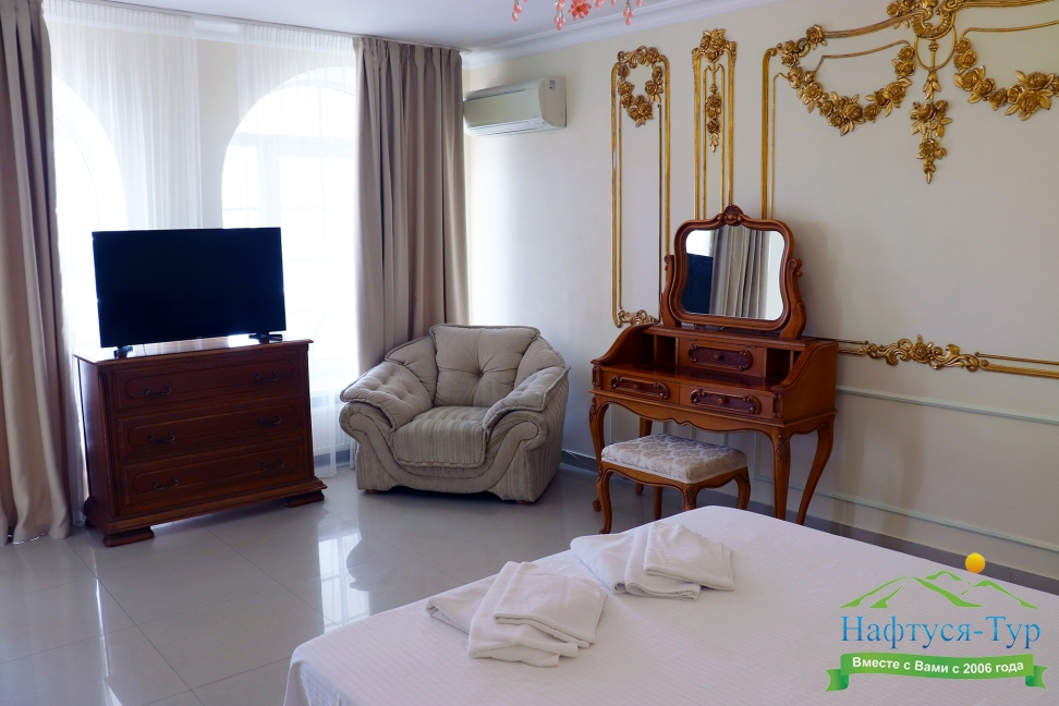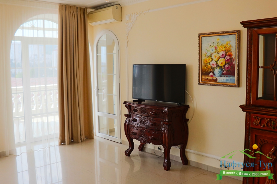 кондиционер, микроволновая печь, мини-холодильник, набор посуды, сейф, телевизор, электрочайник