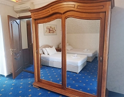 вешалка, диван, зеркало, кровати односпальные, кровать двуспальная, прикроватные тумбочки, стол, стулья, шкаф