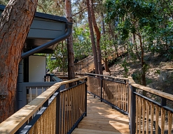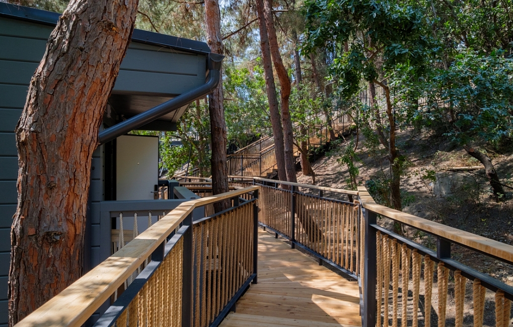 Среди сосен вверх по склону на территории 1,5 га уютно разместились 19 комфортабельных бунгало в непосредственной близости к главному променаду Профессорского уголка Алушты.